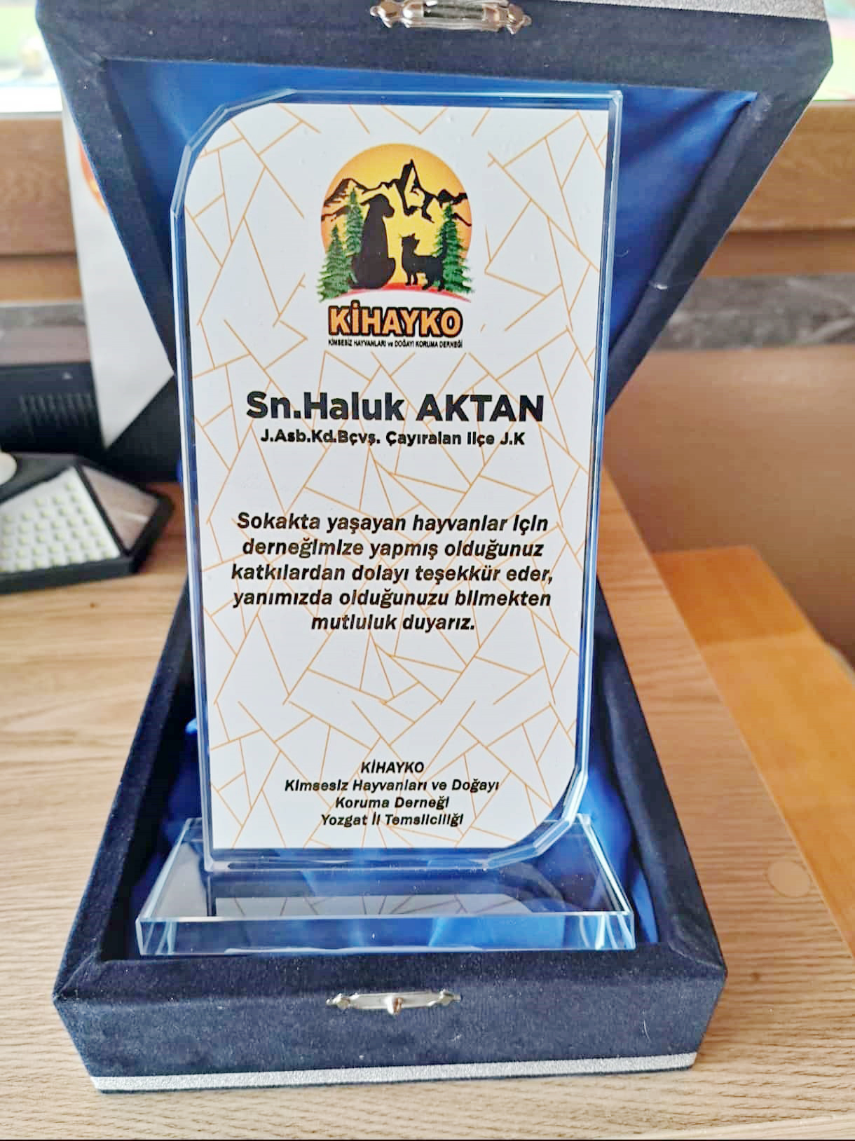 Kimsesiz Hayvanları ve Doğayı Koruma Derneği (KİHAYKO) Yozgat İl Temsilcisi Fahri Genç, beraberinde gönüllü hayvansever İsmail Erciyas ile birlikte Çayıralan ilçesinde sahipsiz hayvanlara gönüllü destek veren İlçe Jandarma Komutanı Astsubay Kıdemli Başçavuş Haluk Aktan’a plaket ve teşekkür belgesi takdim etti.