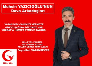 Milli Yol Partisi Yozgat milletvekili aday adayı Feyzullah Vatansever, adaylık başvurusunun ardından yaptığı yazılı açıklamada “Şehit liderimiz Muhsin Yazıcıoğlu’nun dava arkadaşları olarak partimiz Milli Yol Partisi’nde halen Merkez Karar Yönetim Kurulu üyesi olarak, 28. Dönem Milletvekili adaylık müracaatımızı, genel merkezimizde Seçim İşlerinden Sorumlu Genel Başkan Yardımcısı Sayın Şeref Canlı başkanımıza teslim ettik.