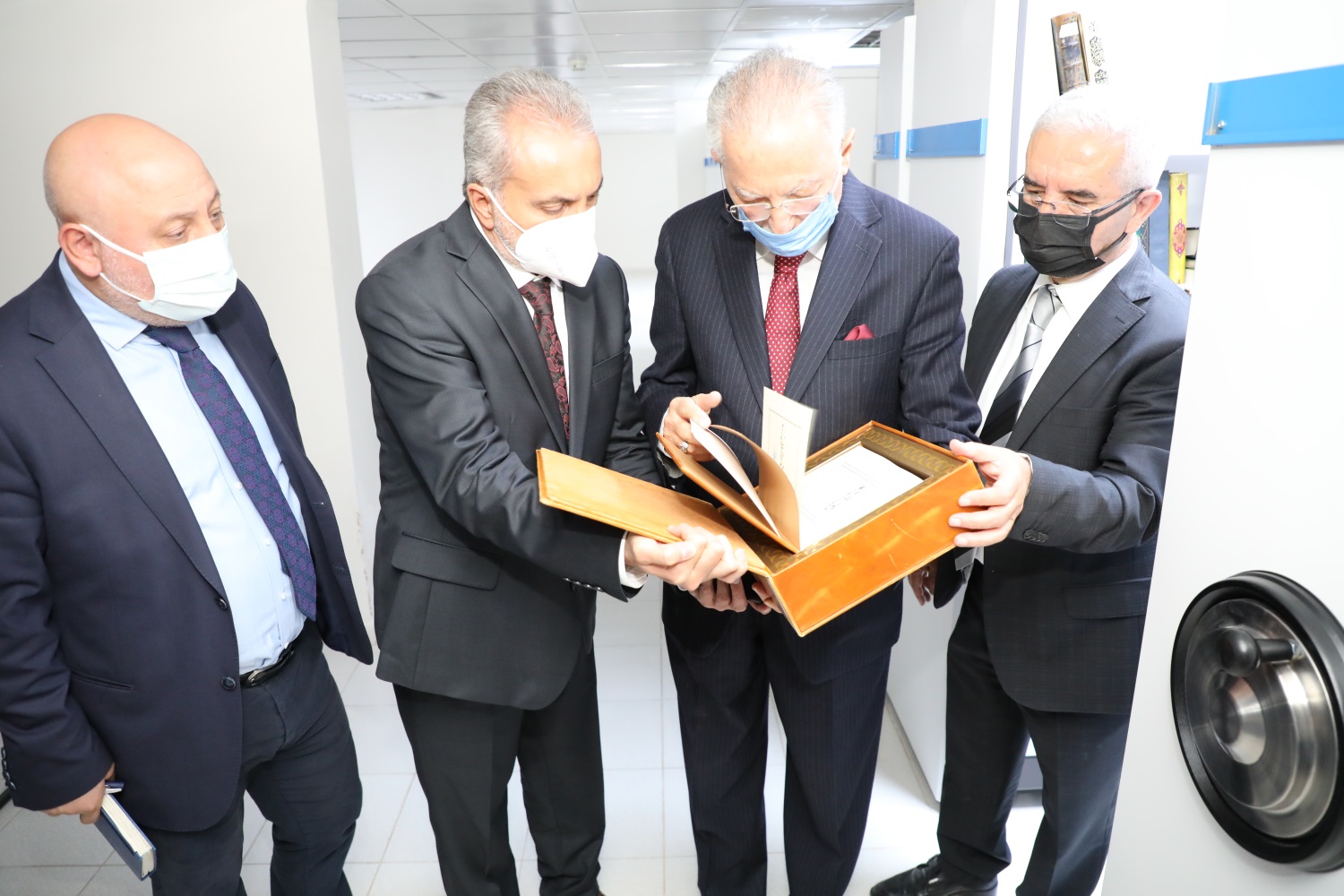 Rektör Karadağ ve Prof. Dr. Ekmeleddin İhsanoğlu ile beraberindeki heyet daha sonra Prof. Dr. Ekmeleddin İhsanoğlu tarafından üniversiteye bağışlanan, tarih, kültür ve medeniyetimize dair önemli eserlerin yer aldığı Ekmeleddin İhsanoğlu Tarih ve Kültür Uygulama ve Araştırma Merkezi’ne ve Kütüphanesine geçerek incelemelerde bulundu.