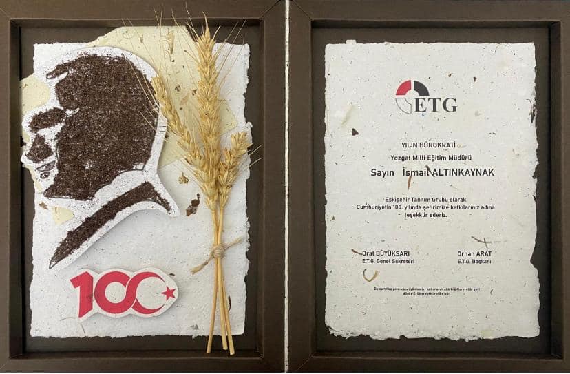 Eskişehir Tanıtım Grubu tarafından düzenlenen bir törende, Yozgat İl Milli Eğitim Müdürü İsmail Altınkaynak, Cumhuriyetimizin 100. yılı münasebetiyle “Yılın Bürokratı” seçildi. Etkinlikte ödülü, Eskişehir Vali Yardımcısı Oğuz Şenlik tarafından Altınkaynak’a takdim edildi.