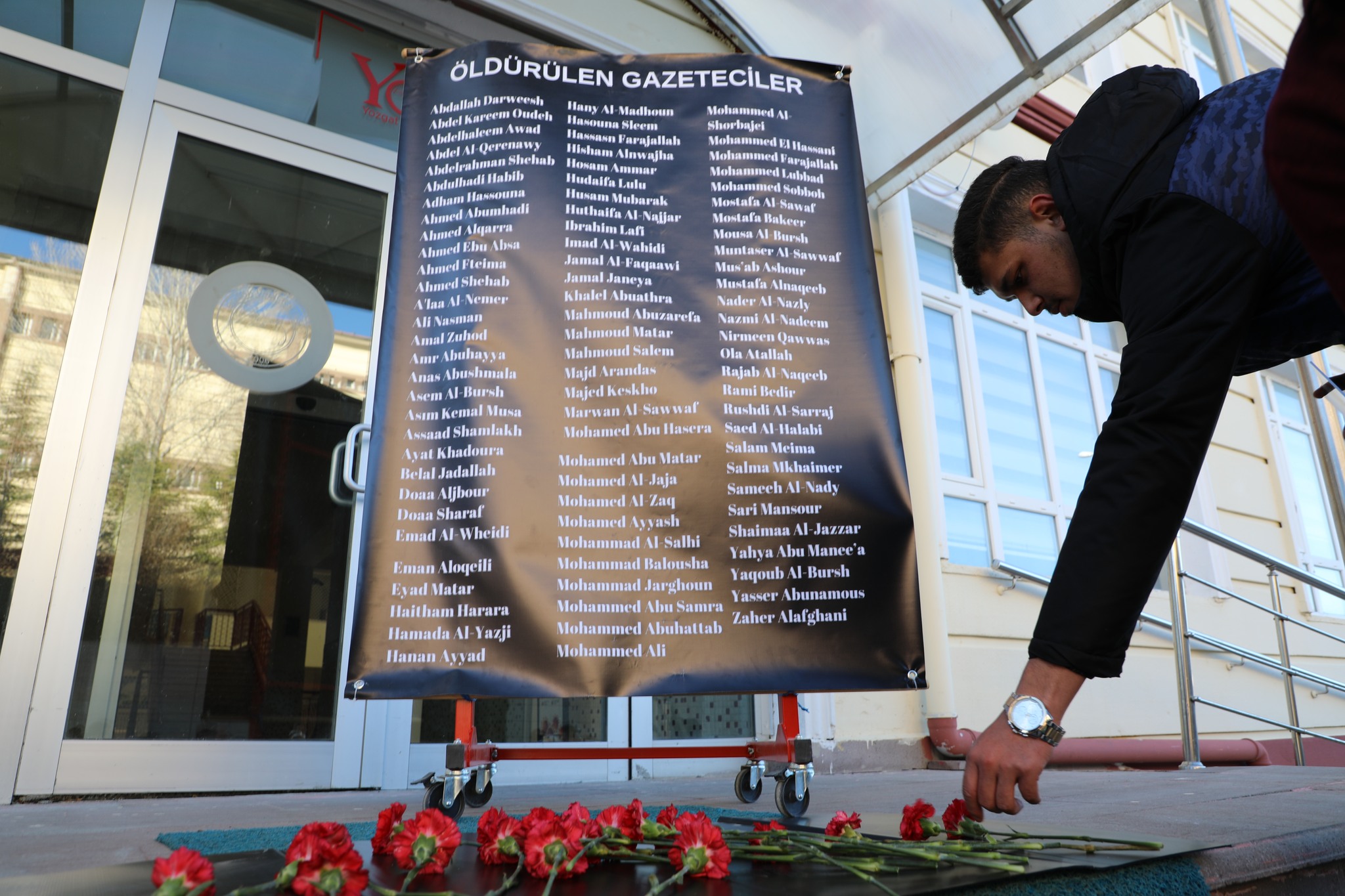 Gazze’de tarihin en büyük gazeteci katliamının yaşandığına dikkat çekilen bildiride hukuka ve sözleşmelere rağmen gazetecileri katleden İsrail kınandı. Bildiri sonrası hayatını kaybeden 97 gazeteci anısına karanfiller bırakıldı.