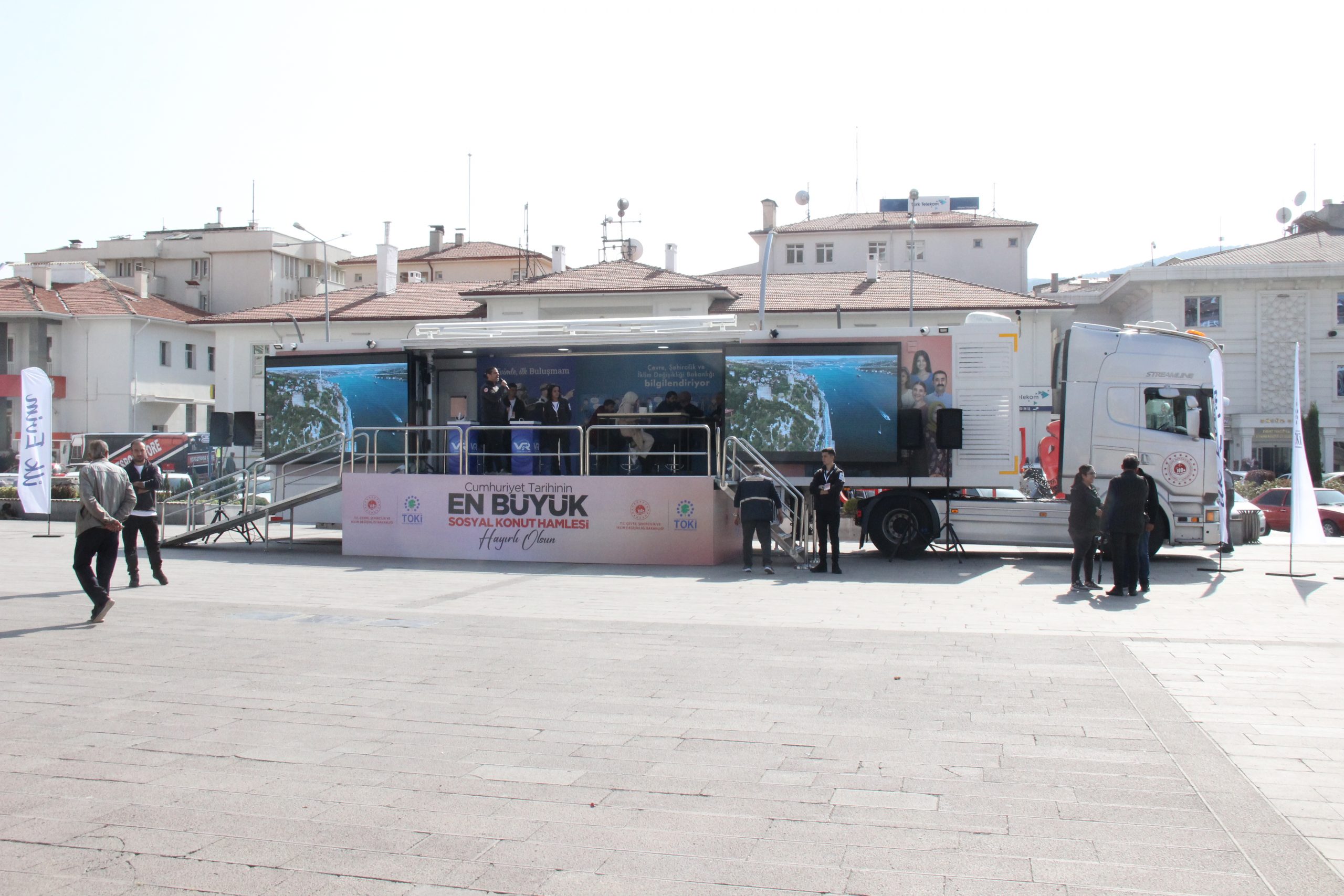 Yozgat’ta Cumhuriyet Meydanı’na kurulan tanıtım tırındaki TOKİ uzmanları, proje hakkında vatandaşları bilgilendirdi. Tırı ziyaret eden vatandaşlar, VR (sanal gerçeklik) gözlükleri sayesinde, daha önce yapımı tamamlanan TOKİ projelerindeki daireleri gezme imkanı buldu.