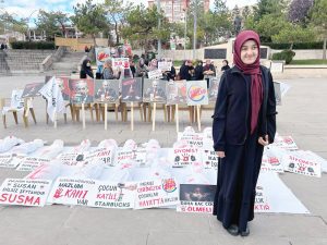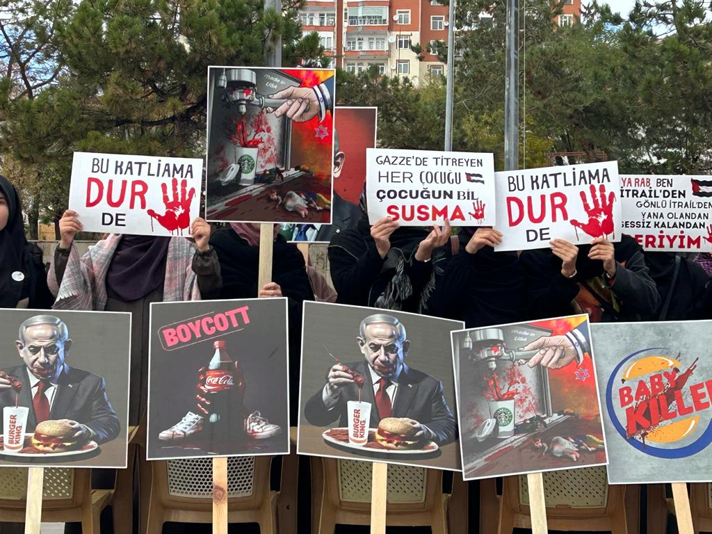 Yağmur,”Siyonist İsrail, 37 gündür çoluk çocuk demeden Filistinli masum sivilleri katlediyor. Bu katliamda da en çok çocuklar, bebekler şehit ediliyor. Anneler şehit ediliyor. Eli silah tutamayacak olanlar şehit ediliyor. Bu katliamı tekrar hatırlatmak, göz önünde bulundurmak, bir farkındalığı oluşturmak anlamında bugün burada bir mizansen dahi olsa, bebekleri, bebek ölümlerini canlandırmak istedik. Kardeşlerimiz, ben annelerden böyle bu yerdeki yavruları şöyle bir alıp hani bunlar bir yapay da olsa, şöyle bir kucaklarına almalarını sanki kendi evlatları şehit ediliyormuş gibi, kendi evlatları öldürülüyormuş gibi o annelerin yaşadıklarını hissetmelerini bekliyoruz, istiyoruz. Ve hani biz bunun neresindeyiz? Biz bu işin ortağı değiliz diyenler de bu ürünleri alarak İsrail’in ürünlerini alarak onlara maddi anlamda destek olarak bir kurşun, bir bomba, bir füzede onların eliyle o çocukların şehit edildiği, o çocukların öldürüldüğünün farkında olmalarını istiyoruz. Bu belli ki daha devam edecek bu süreç. Dünya sessiz kaldıkça bizler buna duyarsız kaldıkça, bu süreç yaşanmaya devam edecek. Biz de bu yaşanmaya devam ettikçe İsrail’in barbarlığını, zulmünü ve soykırımını halkımızın gözü önünde tekrar sergilemeye devam edeceğiz.”diye konuştu.