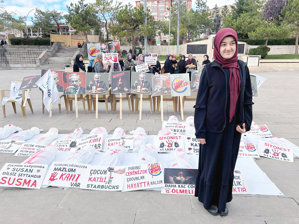 İnfak Derneği Başkanı Ömer Yağmur’un 7.sınıfta okuyan kızı Rabia Yağmur’da etkinliğe katılarak Yozgat halkını İsrail ürünlerini boykot etmeye davet etti.