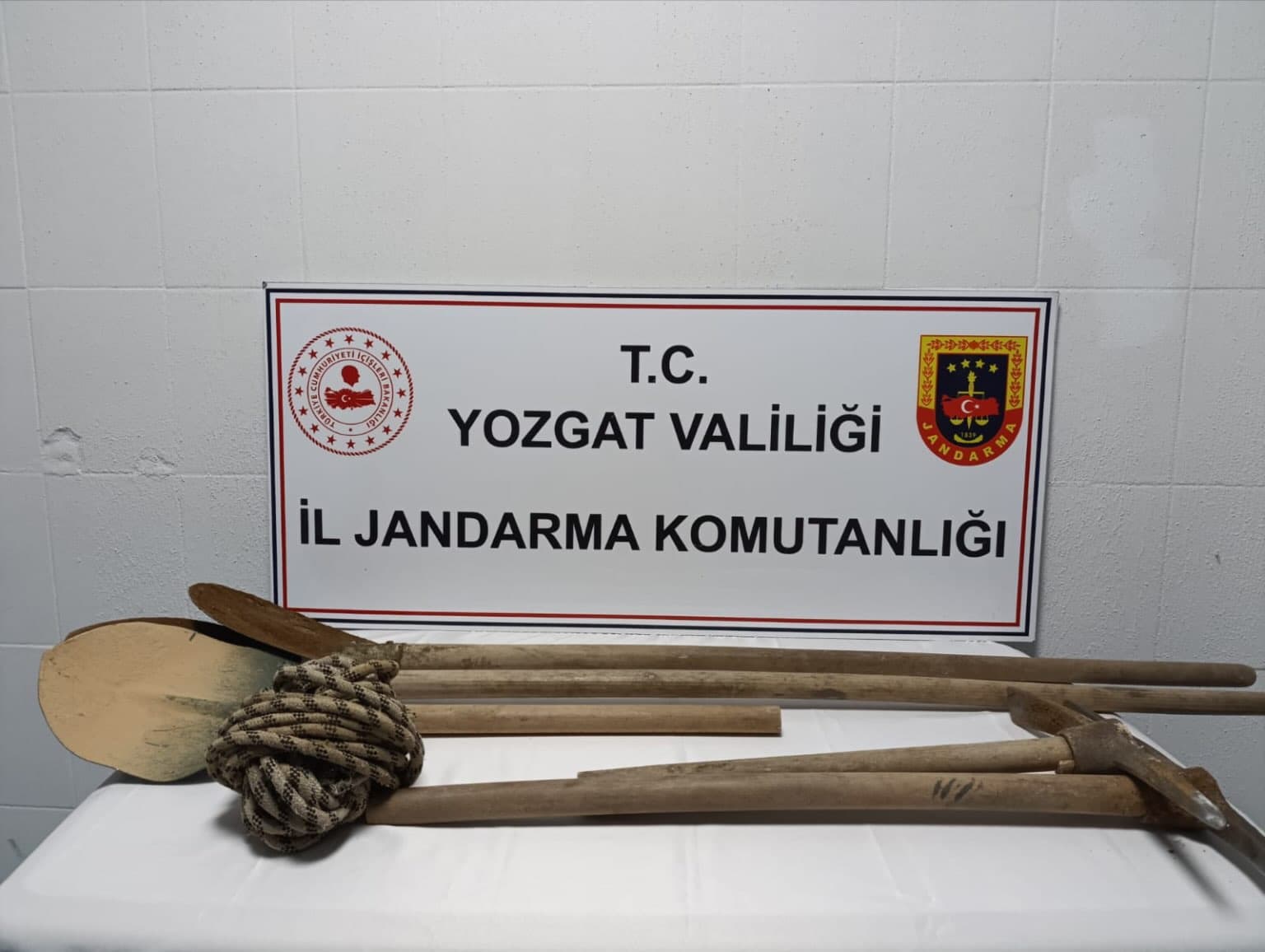 Yerköy ilçesi mevkiinde gerçekleştirilen devriye faaliyeti sırasında arazide izinsiz kazı yapan 3 kişinin tespit edilmesi üzerine, (F.K.), (G.K.) ve (M.A.) isimli şüpheliler yakalandı. Şüpheliler ile birlikte yapılan aramada 3 adet kürek, 2 adet kazma ve 25 metre halat ele geçirildi.