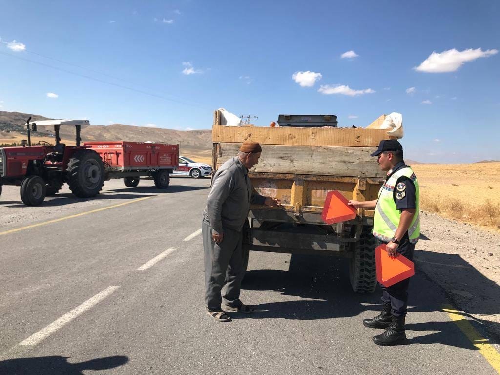 Yozgat-Kumluca köyü yolu üzerinde gerçekleştirilen trafik denetimi sırasında, çiftçilere traktör kazalarının önlenmesi için uyarılar ve bilgilendirmeler yapıldı.