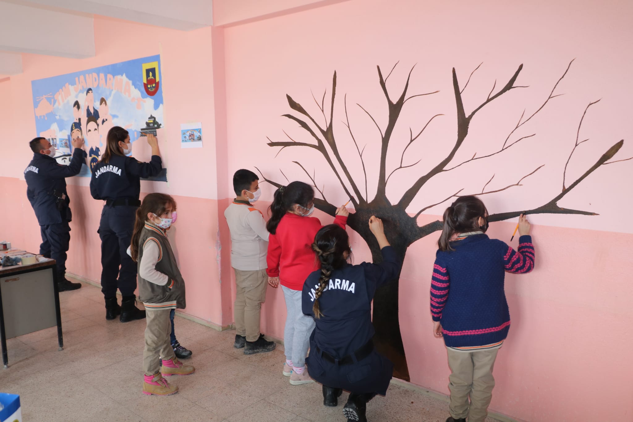 Yozgat İl Jandarma Komutanlığı Aile içi Şiddetle Mücadele ve Çocuk Kısım Amirliği personelleri tarafından ilk ve ortaokul öğrencilerine yönelik jandarmanın görevleri anlatabilmek ve jandarmayı sevdirmek amacıyla “tim jandarma” temalı çizgi film karakterlerini okulun duvarlarına çizim yapılarak tanıtıldı.