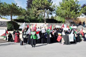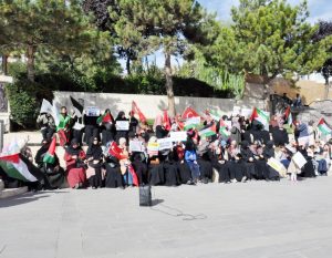 Cumhuriyet Alanı’nda oturma eylemi yapan kadınlar, herkesi İşgalci İsrail’in Gazze Şeridi’ne yönelik saldırılarını bir an önce durdurması için harekete geçmeye davet ettiler.