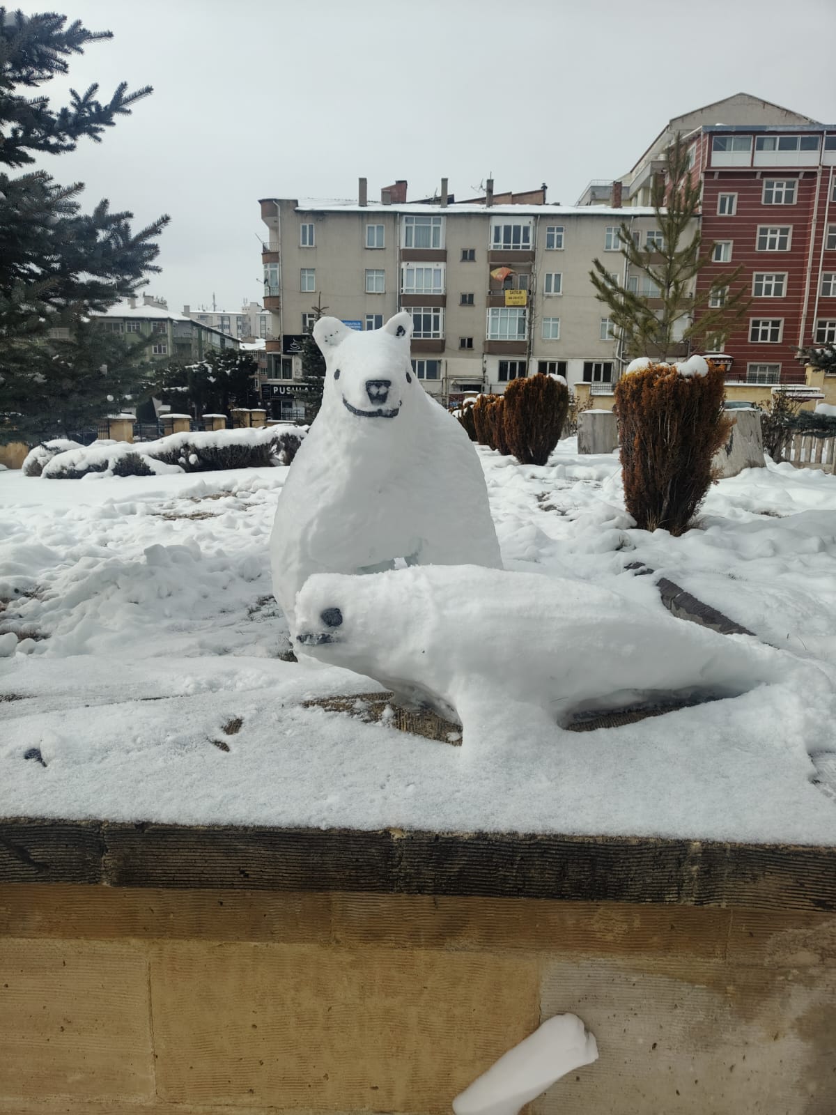 Yozgat’ta bir haftadır aralıklarla etkisini sürdüren kar yağışı, kenti beyaza bürürken ortaya çıkan ilginç kar figürleri de vatandaşların dikkatini çekiyor. Yozgat Lisesi bahçesinde kardan yapılan kutup ayısı ve fok balığı, görenleri hayran bıraktı.