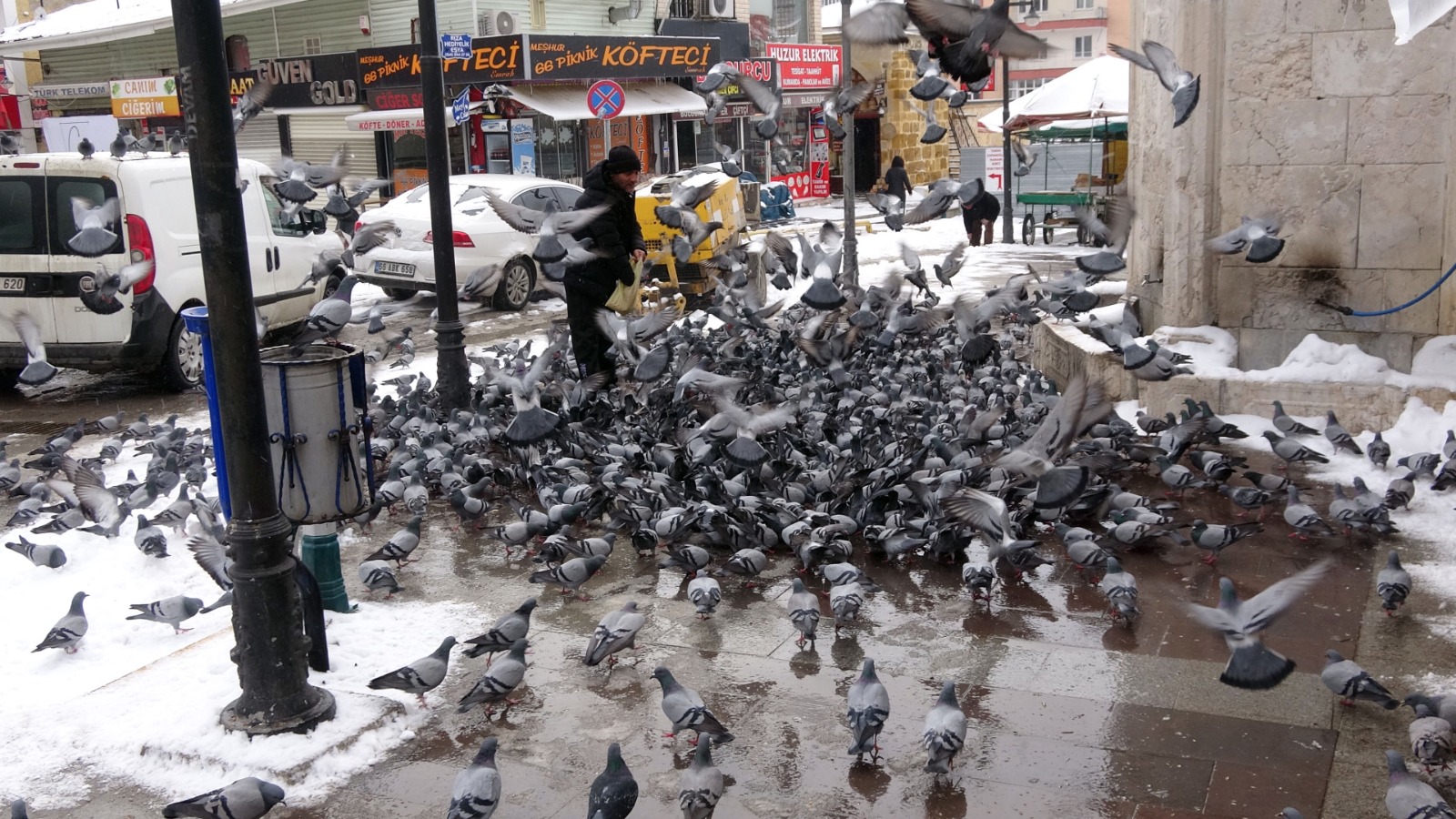 Zaman zaman etkisini arttıran kar yağışı ve soğuk hava nedeniyle bazı binaların çatılarında buz sarkıtları oluşurken karlı havada yiyecek bulmakta güçlük çeken güvercinleri de vatandaşlar besledi.