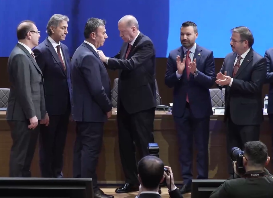 Toplantı başlamadan önce düzenlenen törende, farklı partilerden seçilerek belediye başkanlığı görevine gelen ve yollarına AK Parti çatısı altında devam etme kararı alan isimler sahneye davet edildi. Cumhurbaşkanı Erdoğan, AK Parti ailesine katılan belediye başkanlarına rozetlerini bizzat taktı.