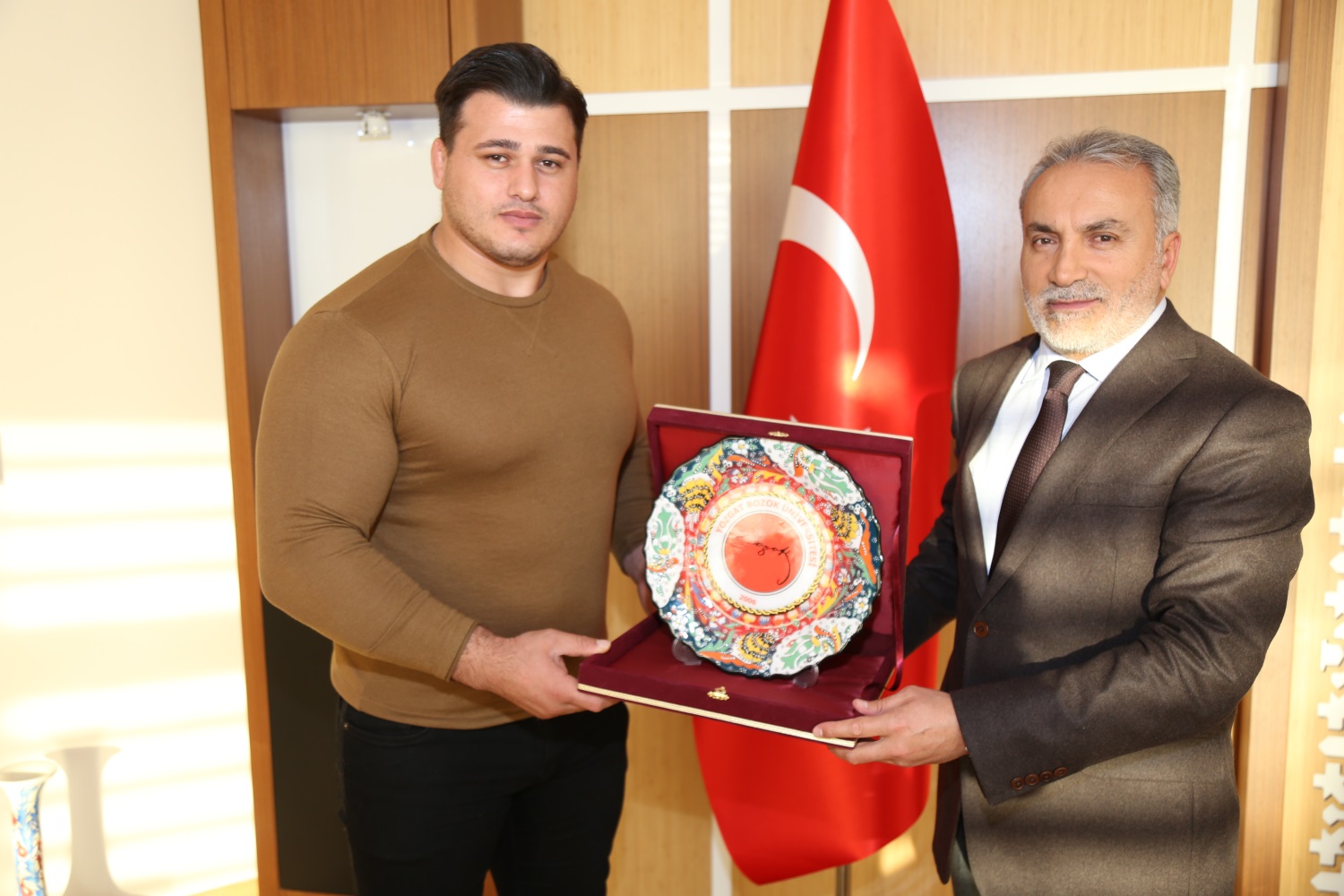 Yozgatlı Milli Güreşçi Dünya Şampiyonu Rıza Kayaalp, Rektör Prof. Dr. Ahmet Karadağ’ı makamında ziyaret etti.
