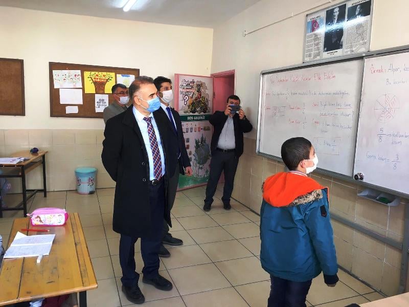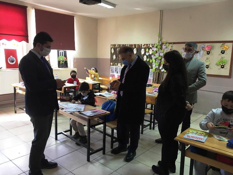 Sarıkaya Kaymakamı Selami Işık ve İlçe Milli Eğitim Müdürü Abdullah Arkan ile birlikte Barbaros İlkokulunu ziyaret ederek yüz yüze başlayan eğitim ve alınan tedbirleri yerinde inceledi.