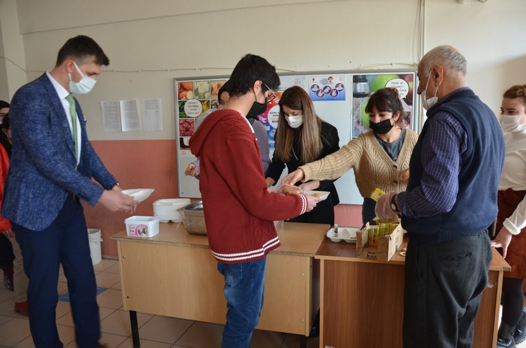 Daha sonra okulda taşımalı eğitim alan öğrencilerle birlikte öğle yemeğinde buluşan Kaymakam Samet Serin öğrencilerle birlikte sıraya girerek öğrencilerle birlikte yemek yedi.