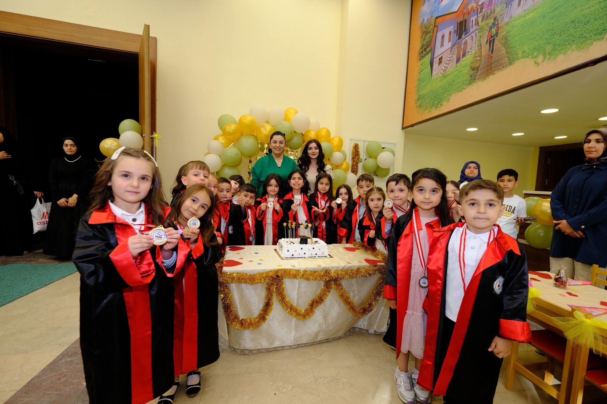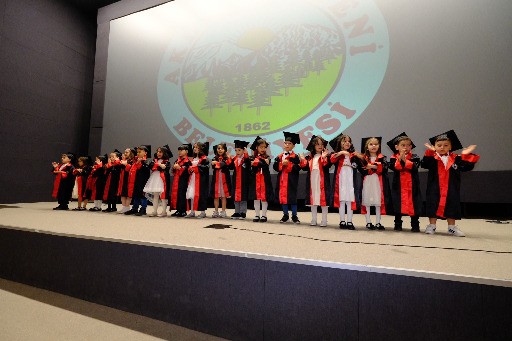 Konuşmanın ardından sahne miniklere bırakıldı. Mezun olan öğrencilere diplomaları Başkan Yalçın ve öğretmenleri tarafından tek tek verildi. Diplomalarını alan çocuklar, hep birlikte keplerini havaya fırlatarak mezuniyetin coşkusunu yaşadı.