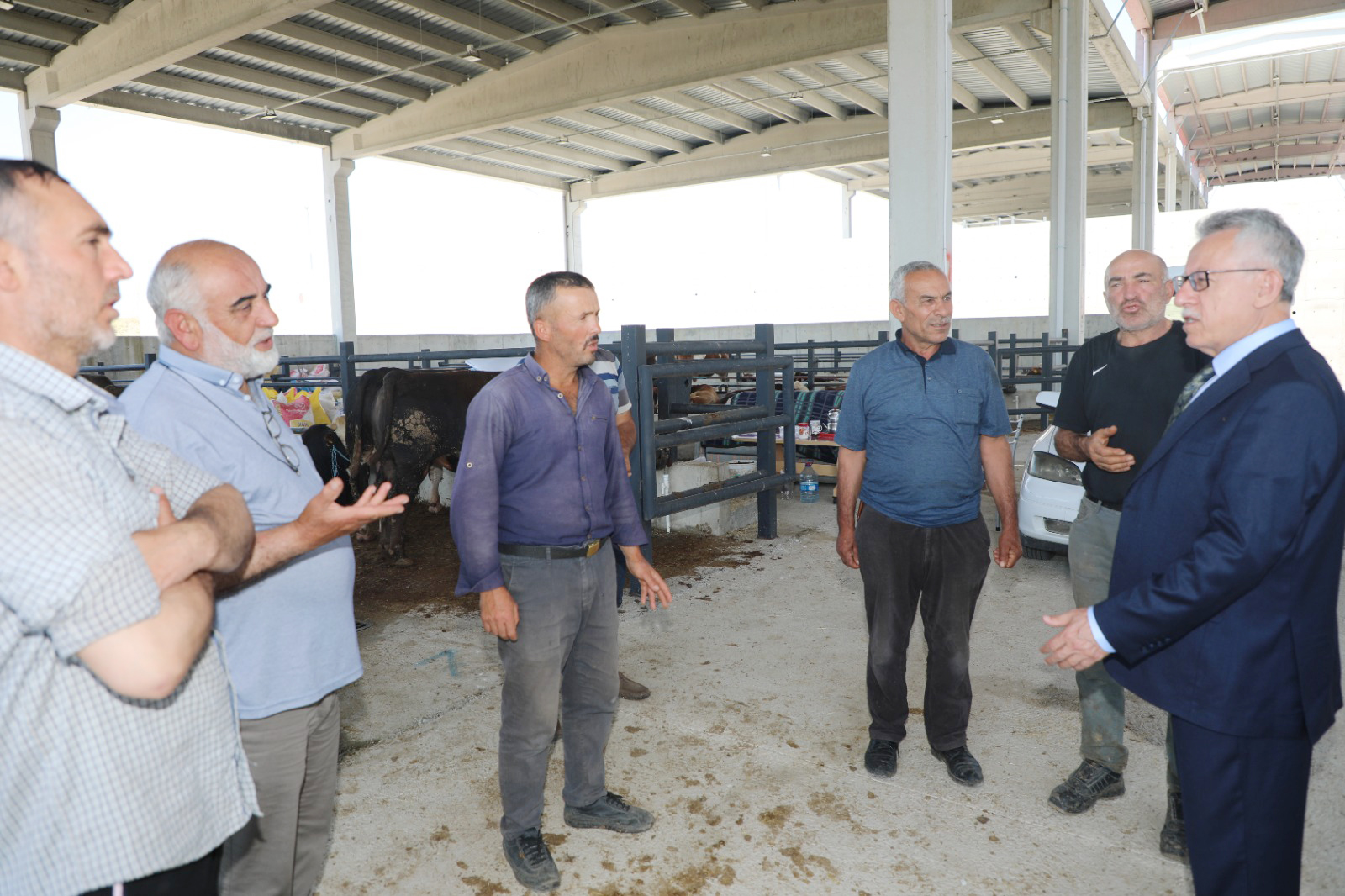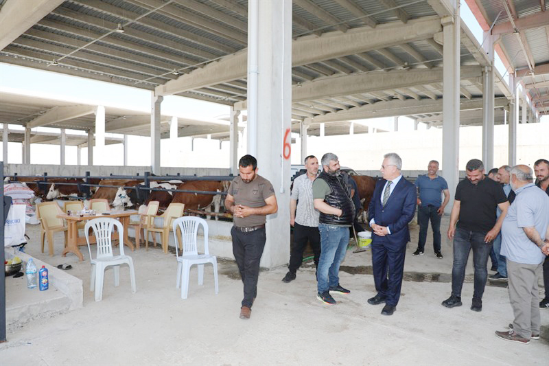 Yozgat Belediyesi Modern Kesimhane ve Hayvan Pazarında incelemelerde bulunan Belediye Başkanı Dr. Kazım Arslan kurbanlık hayvan satan üreticilerden de pazar yeri hakkında bilgi aldı.