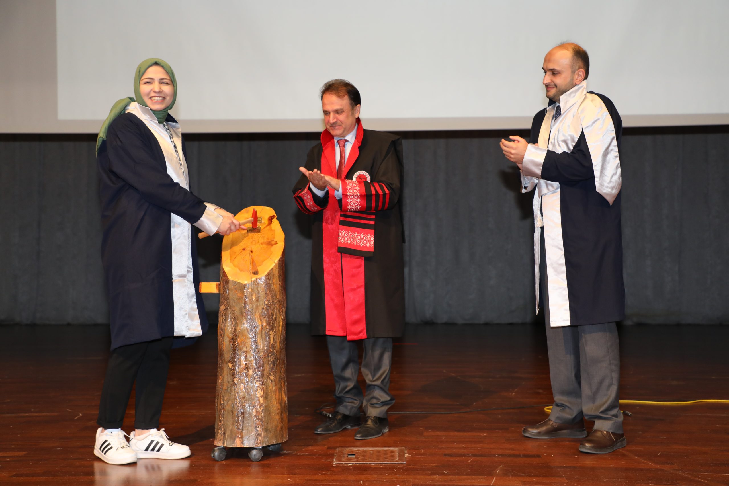 Konuşmaların ardından yüksek lisans ve doktora öğrencisi yetiştiren öğretim üyelerine belgelerinin takdiminin ardından dereceye giren öğrenciler yaş kütüğüne levha çaktı.
