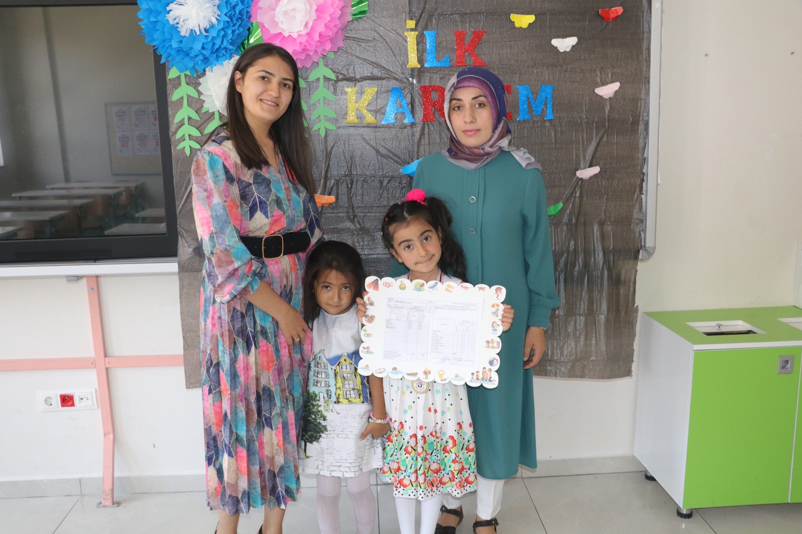 Çocuklar karnelerini öğretmenlerinin elinden alırken gününü anısına hatıra fotoğrafı da çektirmeyi ihmal etmedi.