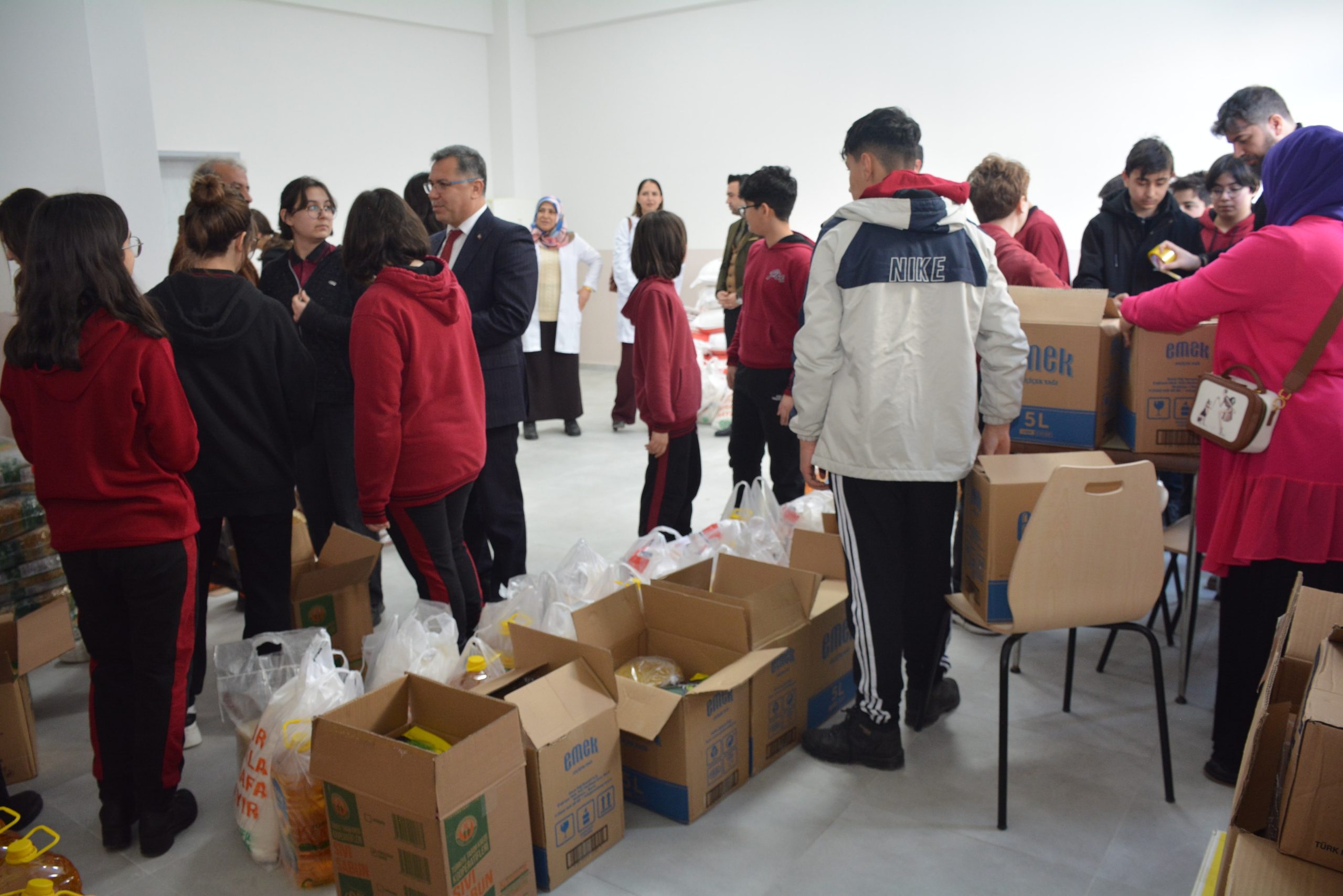 Öğrenciler, kolileri ihtiyaç sahibi ailelere ulaştırılmak üzere paketleyerek hazır hale getirdi.