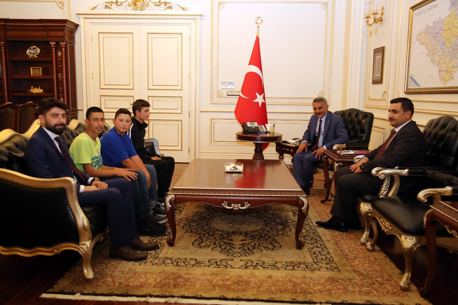 Yenifakılı Kaymakamı Mehmet Şirin Altay ile birlikte Yozgat Valisi Mehmet Ali Özkan’ı makamında ziyaret eden Bektaşlı Şehit Halim Bulut Ortaokulu öğrencileri, okulda eğitim gören tüm öğrencilerin katkısı ile hazırlanan tabloyu hediye ettiler.
