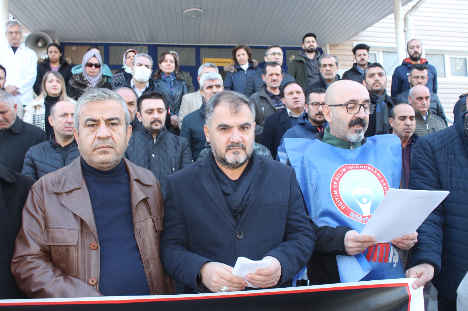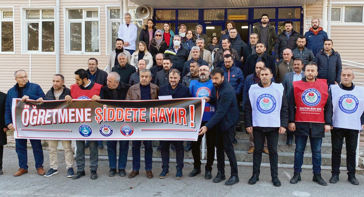 Eğitim çalışanlarının yalnız ve sahipsiz olmadıklarını vurgulayan Şerefli, “Eğitim-Öğretim yılının ilk döneminin bittiği, öğrencilerimizin karne heyecanı ve mutluluğu yaşayacağı, öğretmen ve eğitim çalışanlarımızın tatile girecekleri günde şu anda önünde bulunduğumuz Atatürk Mesleki ve Teknik Anadolu Lisemizde müdür yardımcısı olarak görev yapan öğretmen arkadaşımız Abuzer Akın İstiklal Marşı töreninde uyardığı öğrencinin yakını tarafından odasında bıçaklı saldırıya uğramış engellemeye çalışırken kafa darbesi ile yaralanmıştır. Ebuzer öğretmenimize, yöneticilerimize ve okulda görevli tüm öğretmen ve eğitim çalışanlarımıza geçmiş olsun diyor, arkadaşımıza yapılan bu menfur saldırıyı şiddetle kınıyoruz.Ebuzer arkadaşımızın, öğretmenlerimizin, eğitim çalışanlarımızın yalnız ve sahipsiz olmadıklarını buradan ilan ediyoruz.”dedi.