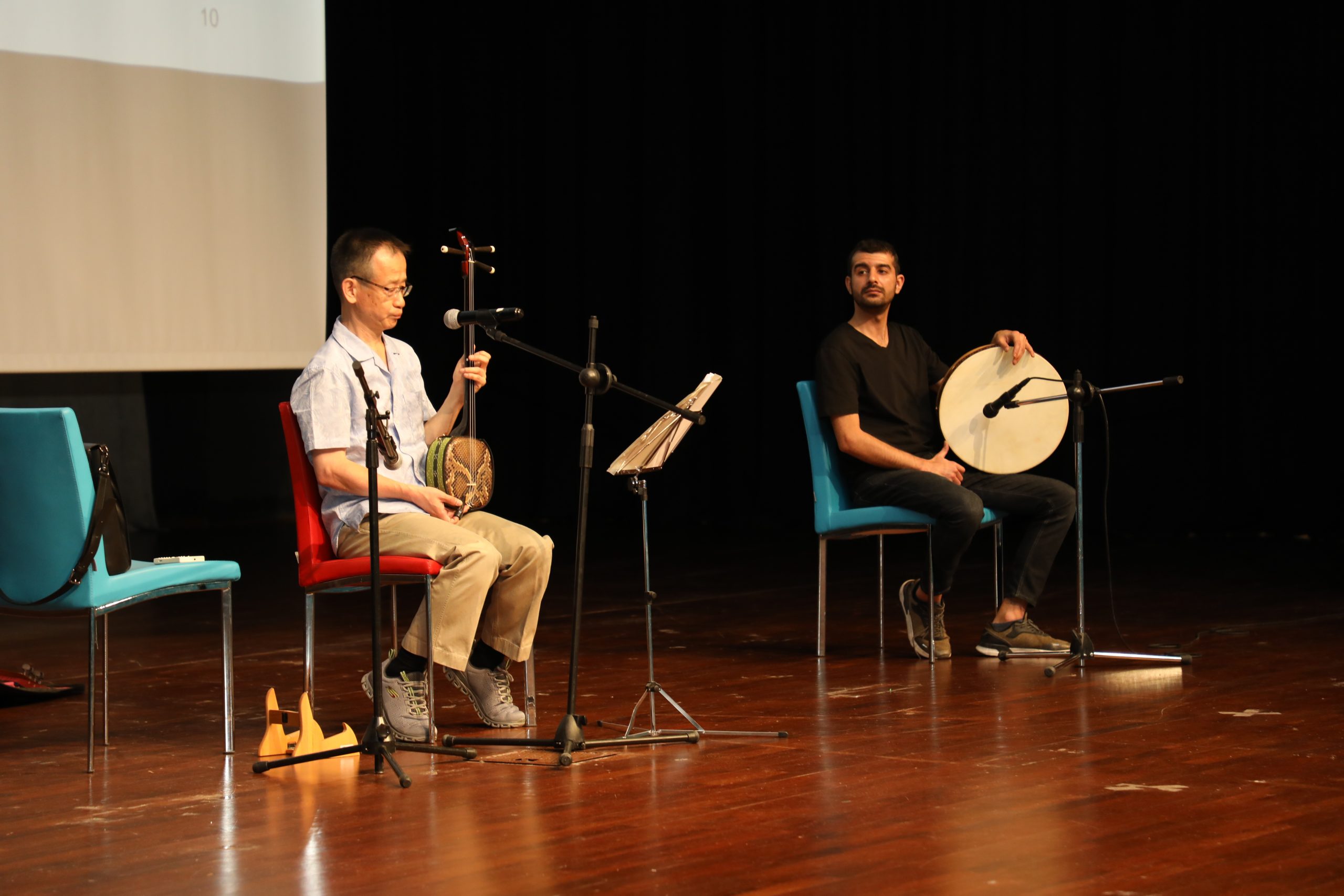 Katılımcıları Okinawa’nın tarihi, kültürü ve dili ile ilgili bilgilendiren Iwasa, Okinawa müziğini tanımlayan üç telli bir ud’a benzeyen yılan derisi ile kaplı ve işaret parmağına takılan bir mızrapla çalınan sanshin adlı enstrümanıyla Okinawa türküleri seslendirdi.