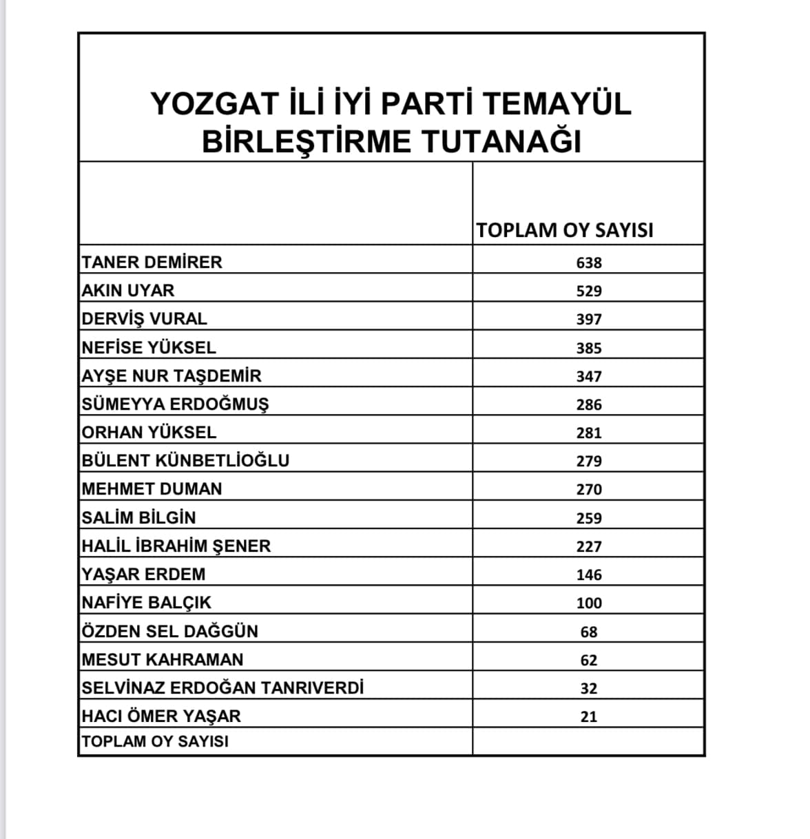 “Taner Demirer 638, Akın Uyar 529, Derviş Vural 397, Nefise Yüksel 385, Ayşenur Taşdemir 347, Sümeyya Erdoğmuş 286, Orhan Yüksel 281, Bülent Künbetlioğlu 279, Mehmet Duman 270, Halil İbrahim Şener 227, Yaşar Erdem 146, Nafiye Balçık 100, Özden Sel Dağgün 68, Mesut Kahraman 62, Selvinaz Erdoğan Tandıverdi 32, Hacı Ömer Yaşar 21” / Haber Merkezi