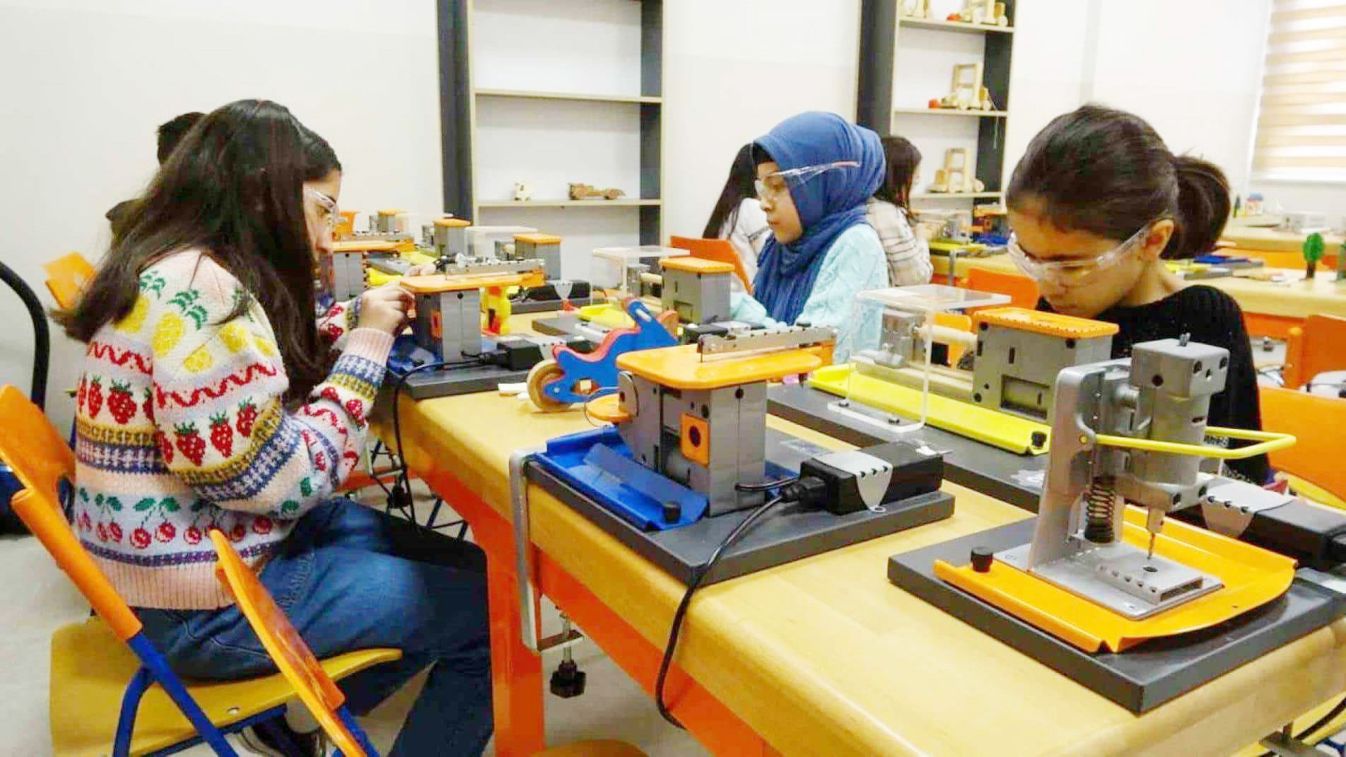 Öğrenciler, öğretmenlerinin gözetiminde güvenlikli mini tezgahlarda matkap, testere ve zımpara gibi aletleri kullanarak ahşap parçaları birleştirerek çeşitli oyuncaklar üretiyorlar. Bu oyuncaklar daha sonra köy okullarındaki öğrencilere hediye ediliyor.