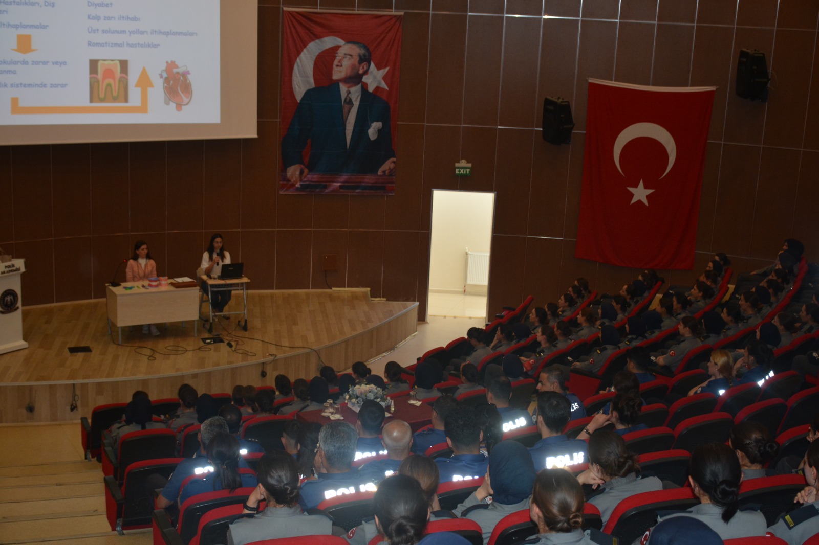 Yozgat Toplum Sağlığı Merkezinde görevli Diş Hekimleri Merve Sandalcı ve Saadet Sultan Yıldırım tarafından Yozgat Polis Meslek Eğitim Merkezi’nde gerçekleştirilen eğitimde, 350 polis adayı ile kurum personeline koruyucu ağız ve diş sağlığı konusunda bilgi verildi.