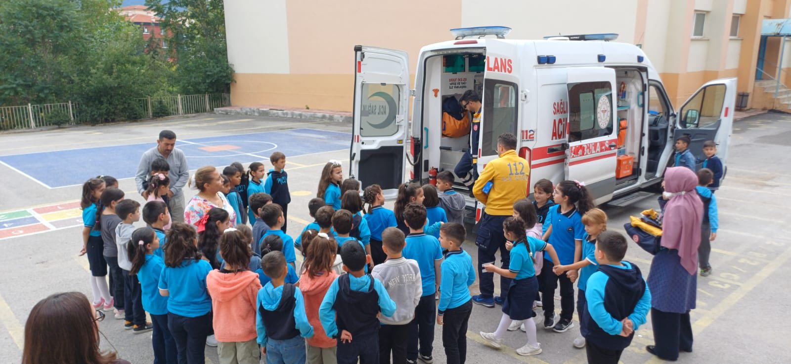 Özellikle okul bahçesine getirilen 112 acil sağlık ambulansı, miniklerin büyük ilgisini çekti. Öğrenciler, ambulansı yakından inceleme ve sağlık görevlilerinden bilgi alma fırsatı buldular. Koruyucu sağlık hizmetleri kapsamında nasıl sağlığımızı koruyacağımız konuları uygulamalı olarak gösterilerek, çocukların aktif katılımı sağlandı.