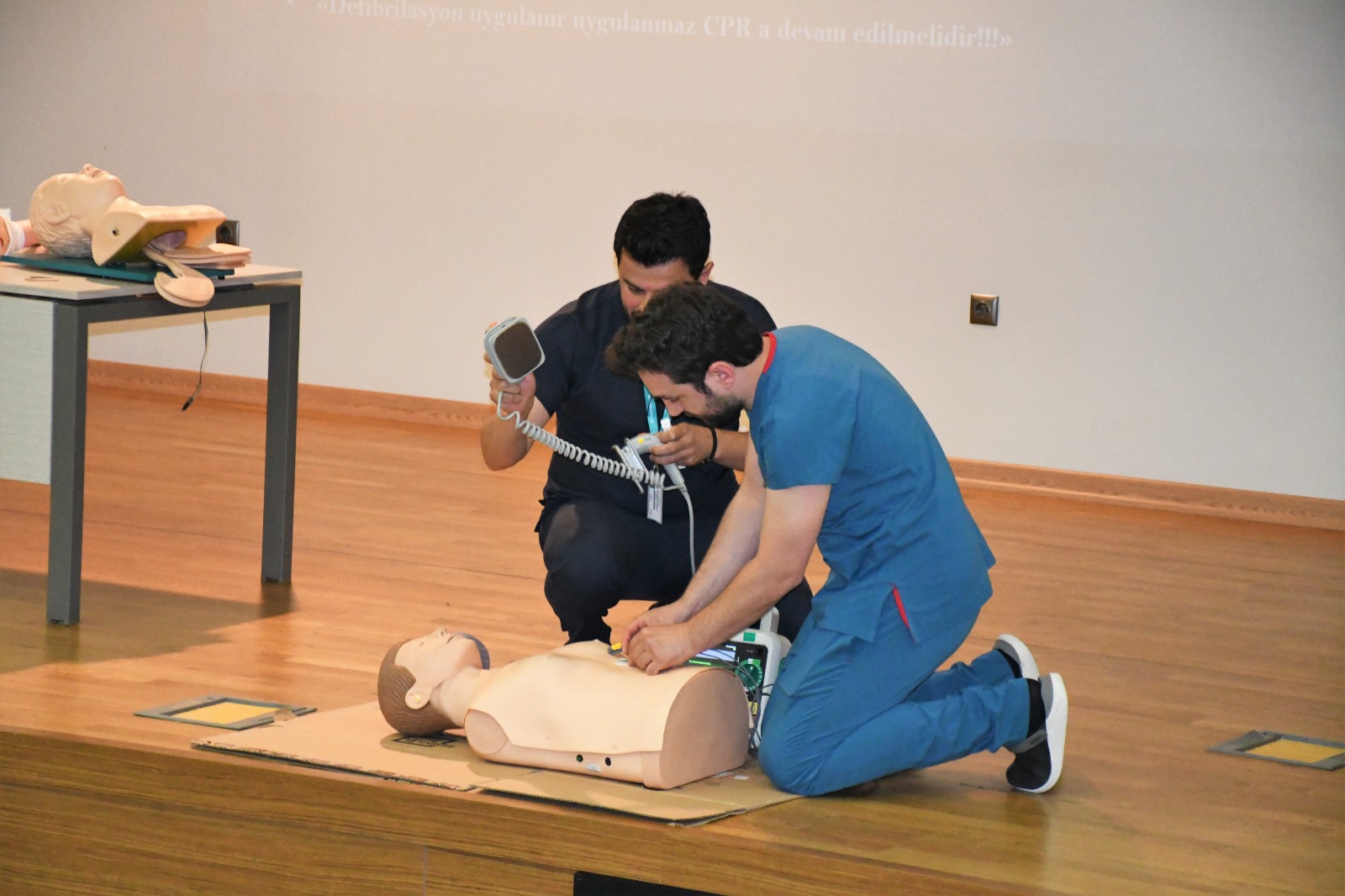 Yozgat Şehir Hastanesinde konferans salonunda teorik ve uygulamalı düzenlenen eğitim 2 gün sürdü. Eğitimde hastane personellerine “Kardiyo Pulmoner Resusitasyon (CPR) ve Temel ilk yardım,” konuları Acil Tıp Uzmanı Dr. Yasin Doğan ve hemşire Ömer Kelle tarafından anlatıldı. 400 sağlık çalışanının katıldığı eğitimde yaşanabilecek bir kaza veya yaşamı tehlikeye düşüren bir durumda, görevli sağlık ekiplerinin olay yerine intikaline kadarki sürede, yaralıların hayatının kurtarılması ya da durumun kötüye gitmesini önleyebilmek amacı ile olay yerinde, tıbbi araç gereç aranmaksızın, mevcut araç ve gereçlerle yapılan ilaçsız uygulamalar anlatıldı.