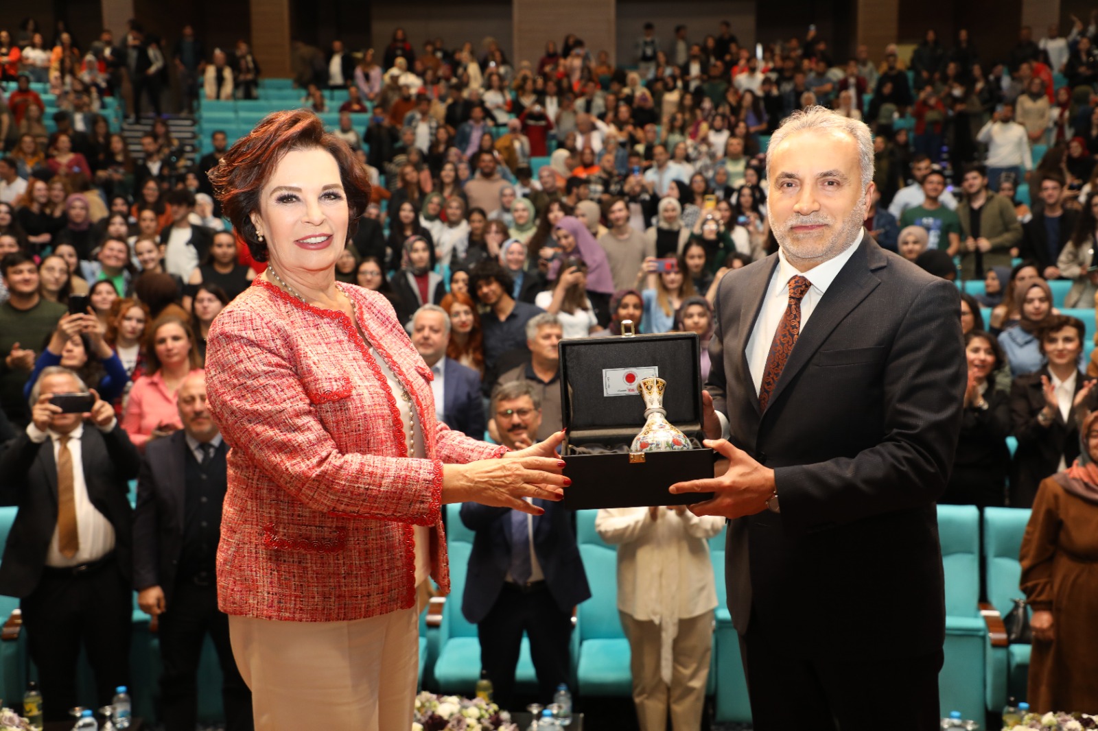 Rektör Prof. Dr. Ahmet Karadağ’da söyleşinin sonunda Yeşilçam ve Türk Sinemasının duayen ismi Hülya Koçyiğit’e günün anısına hediye takdiminde bulundu.