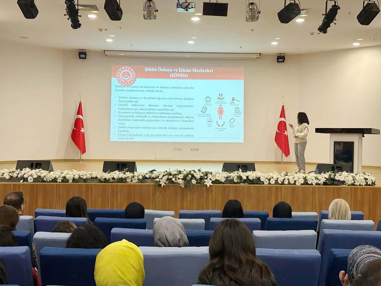 Seminerde, kadına yönelik şiddetin önlenmesi, toplumsal farkındalığın artırılması, kadın hakları ve mevcut destek mekanizmalarının etkin kullanımı konularında kapsamlı sunumlar yapıldı.