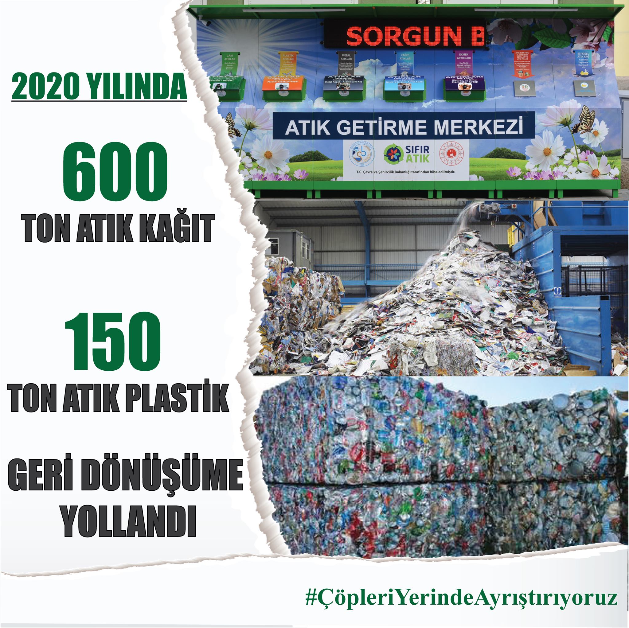 Başkanı Ekinci, “Sorgun Belediyesi olarak ambalaj atıklarının kaynağında evsel atıklara karıştırılmadan ayrı toplanması ve geri kazanılması için çalışmalarımızı sürdürüyoruz. Okullar, resmi daireler, iş yerleri ve işlek caddelerimize ambalaj atığı toplama noktaları oluşturarak 2020 yılı içerisinde 600 ton 150 ton plastik atık toplanarak geri dönüşüm tesisimizde gerekli işlemler yapılarak bu atıkların çevreye verecekleri zararların önüne geçtik.
