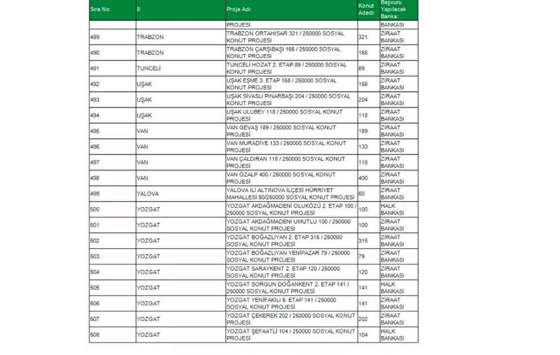 Erdoğan, “Bu devasa sosyal konut projemizin ilk etabını oluşturan 250 bin sosyal konutu, 250 konut arsasını ve 10 bin iş yerini 2 yılda bitirerek hak sahiplerinin kullanımına sunmayı planlıyoruz. Projemizin bu ilk etabı dahi Cumhuriyet tarihimizin en büyük en kapsamlı sosyal konut atılımıdır. İlk etap konutumuzdan 50 binini İstanbul’da, 18 bini Ankara’da, 12 bin 500’ünü İzmir’de, 10 binini Gaziantep’te, 8 bin 650’sini Bursa’da, 7 bin 500’ünü Konya’da, 4 bin 500’ünü Kayseri’de inşa edeceğiz. Diğer illerimizde de nüfuslarına göre değişen sayılarda konut inşası gerçekleştireceğiz.”dedi.