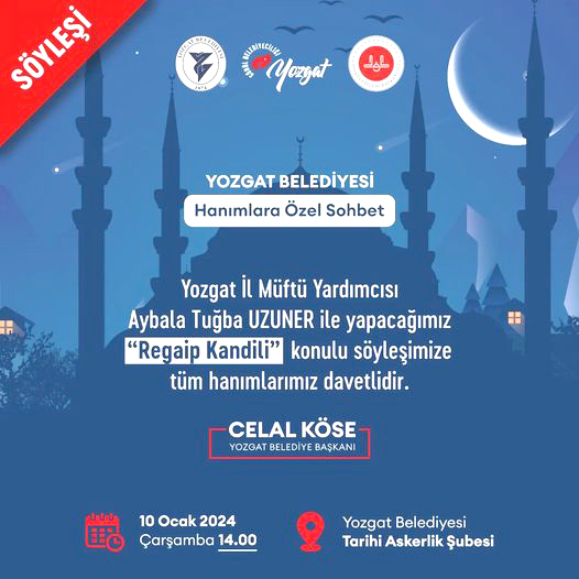 Yozgat Belediyesi’nin hanımlara yönelik düzenlediği özel söyleşilerine bu hafta da devam ediyor. “Regaip Kandili” konulu sohbet programında Yozgat İl Müftü Yardımcısı Aybala Tuğba Uzuner konuk olacak. Tüm hanımların davetli olduğu etkinlik, Yozgat Belediyesi Eğitim ve Kültür Merkezi’nde (Tarihi Askerlik Şubesi) gerçekleşecek.