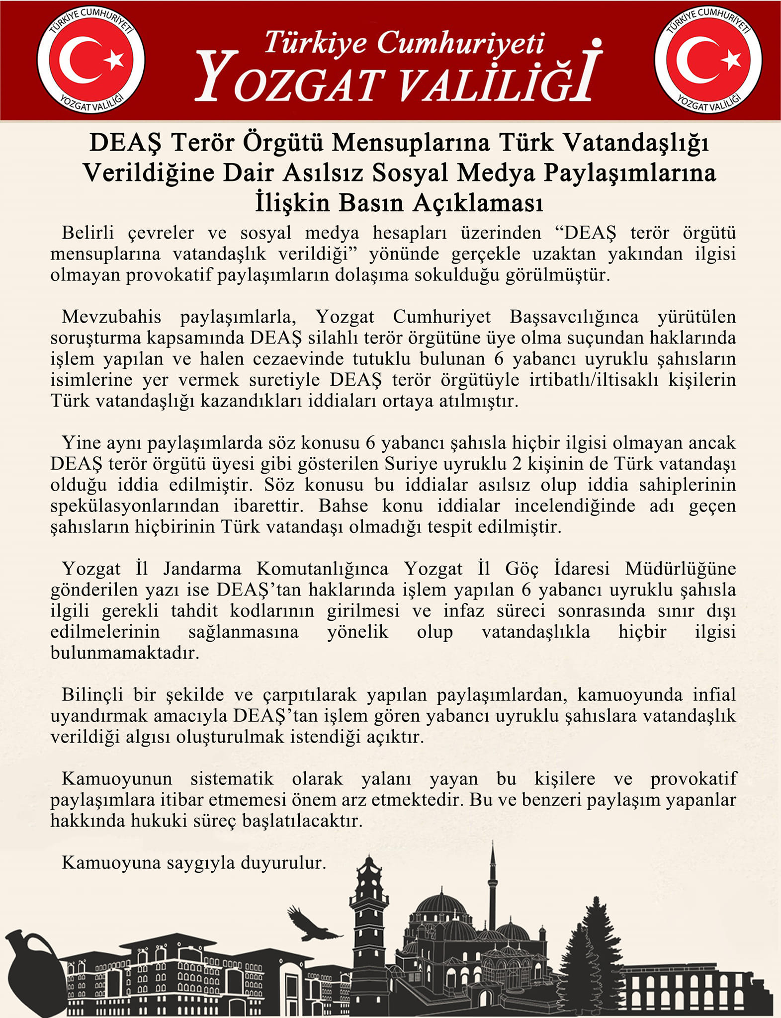 Valilikten yapılan açıklamada şu ifadelere yer verildi: “DEAŞ Terör Örgütü Mensuplarına Türk Vatandaşlığı Verildiğine Dair Asılsız Sosyal Medya Paylaşımlarına İlişkin Basın Açıklaması Belirli çevreler ve sosyal medya hesapları üzerinden “DEAŞ terör örgütü mensuplarına vatandaşlık verildiği” yönünde gerçekle uzaktan yakından ilgisi olmayan provokatif paylaşımların dolaşıma sokulduğu görülmüştür. Mevzubahis paylaşımlarla, Yozgat Cumhuriyet Başsavcılığınca yürütülen soruşturma kapsamında DEAŞ silahlı terör örgütüne üye olma suçundan haklarında işlem yapılan ve halen cezaevinde tutuklu bulunan 6 yabancı uyruklu şahısların isimlerine yer vermek suretiyle DEAŞ terör örgütüyle irtibatlı/iltisaklı kişilerin Türk vatandaşlığı kazandıkları iddiaları ortaya atılmıştır. Yine aynı paylaşımlarda söz konusu 6 yabancı şahısla hiçbir ilgisi olmayan ancak DEAŞ terör örgütü üyesi gibi gösterilen Suriye uyruklu 2 kişinin de Türk vatandaşı olduğu iddia edilmiştir. Söz konusu bu iddialar asılsız olup iddia sahiplerinin spekülasyonlarından ibarettir. Bahse konu iddialar incelendiğinde adı geçen şahısların hiçbirinin Türk vatandaşı olmadığı tespit edilmiştir.