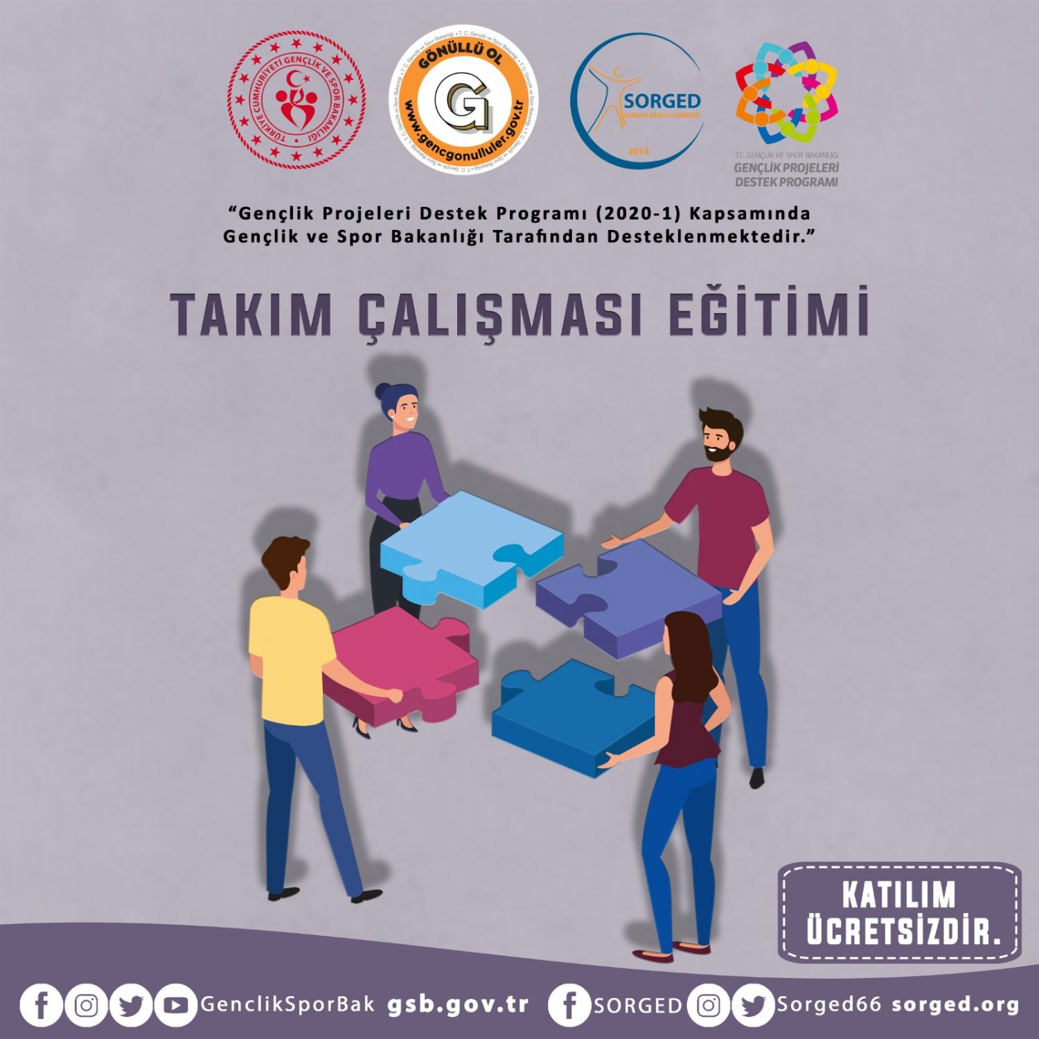 Gençlik Projeleri Destek Programı (2020-1) kapsamında Gençlik ve Spor Bakanlığı tarafından desteklenen, Sorgun Gençlik Derneği koordinatörlüğünde ve Sorgun Gençlik Merkezi işbirliğinde tarafından yürütülen “Genç Değişim, Genç Gelişim” başlıklı proje çerçevesinde “Takım Çalışması” düzenlenecek.
