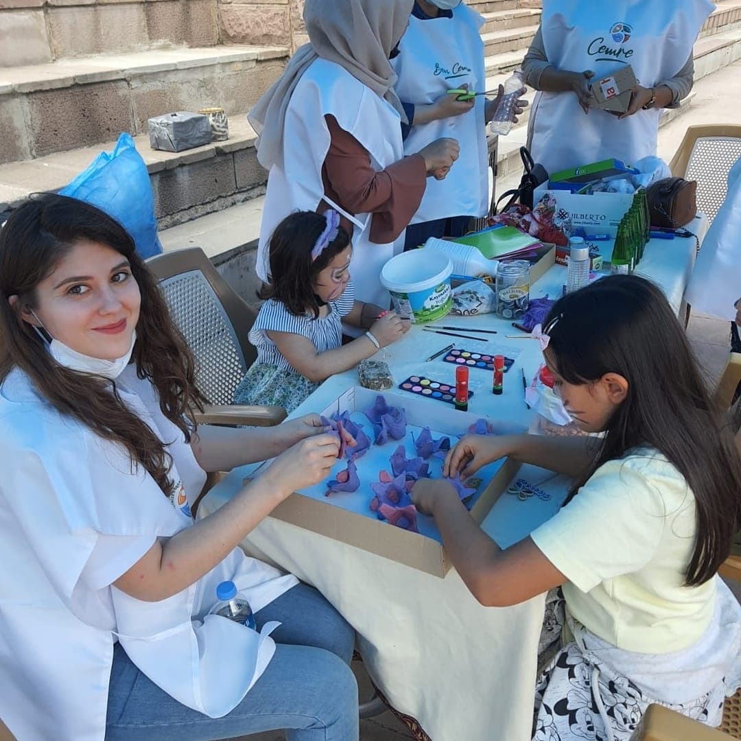 Evlerinden getirdikleri atık materyalleri yeniden kullanabilecekleri tasarımlara dönüştürdüler. Çikolata kutuları masa organizerine, yoğurt kovası ufak dokunuşlarla şık bir saksıya, yumurta kolisinden ve taşlardan birbirinden şık tablolar, şişelerden vazolar, kalemlikler.