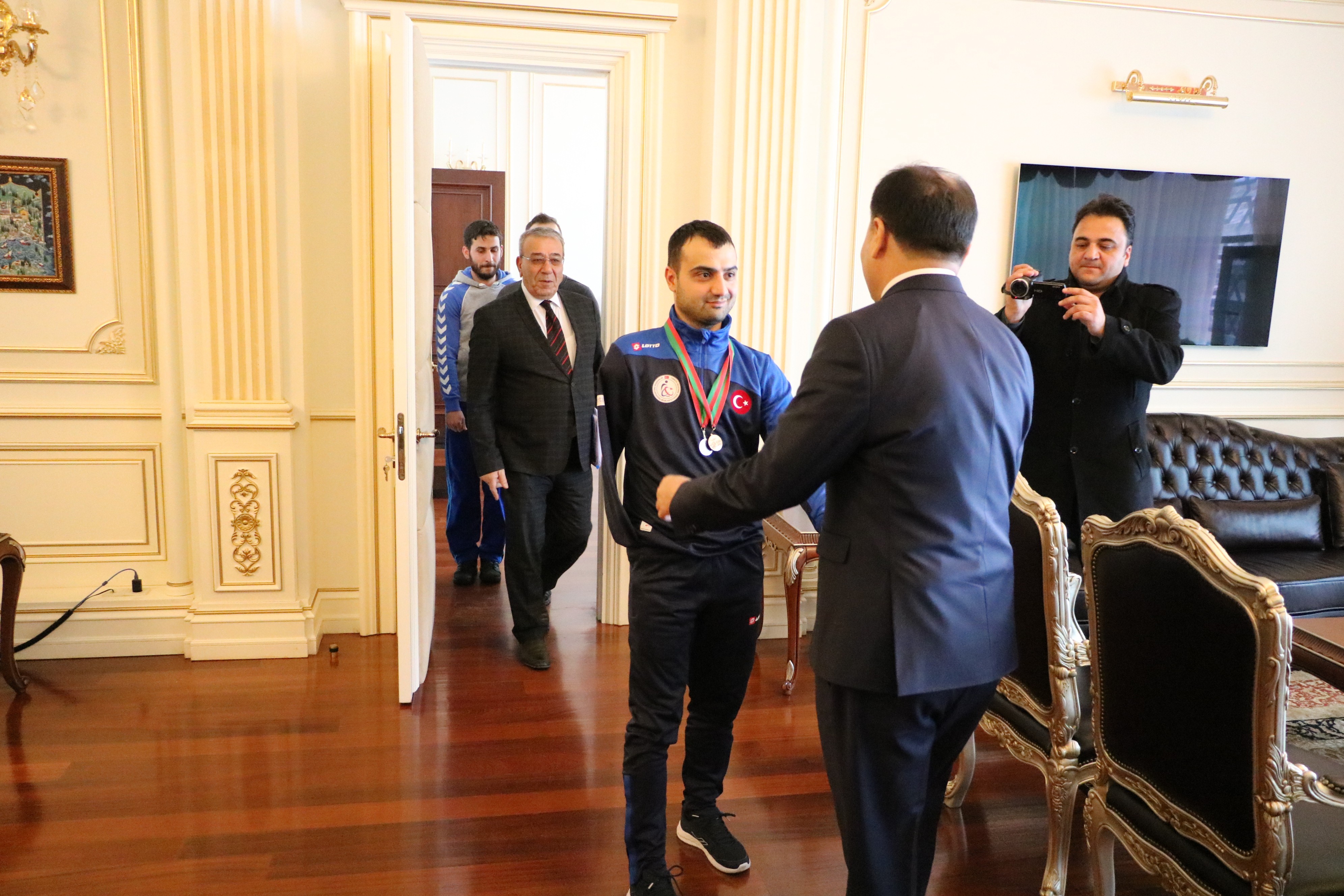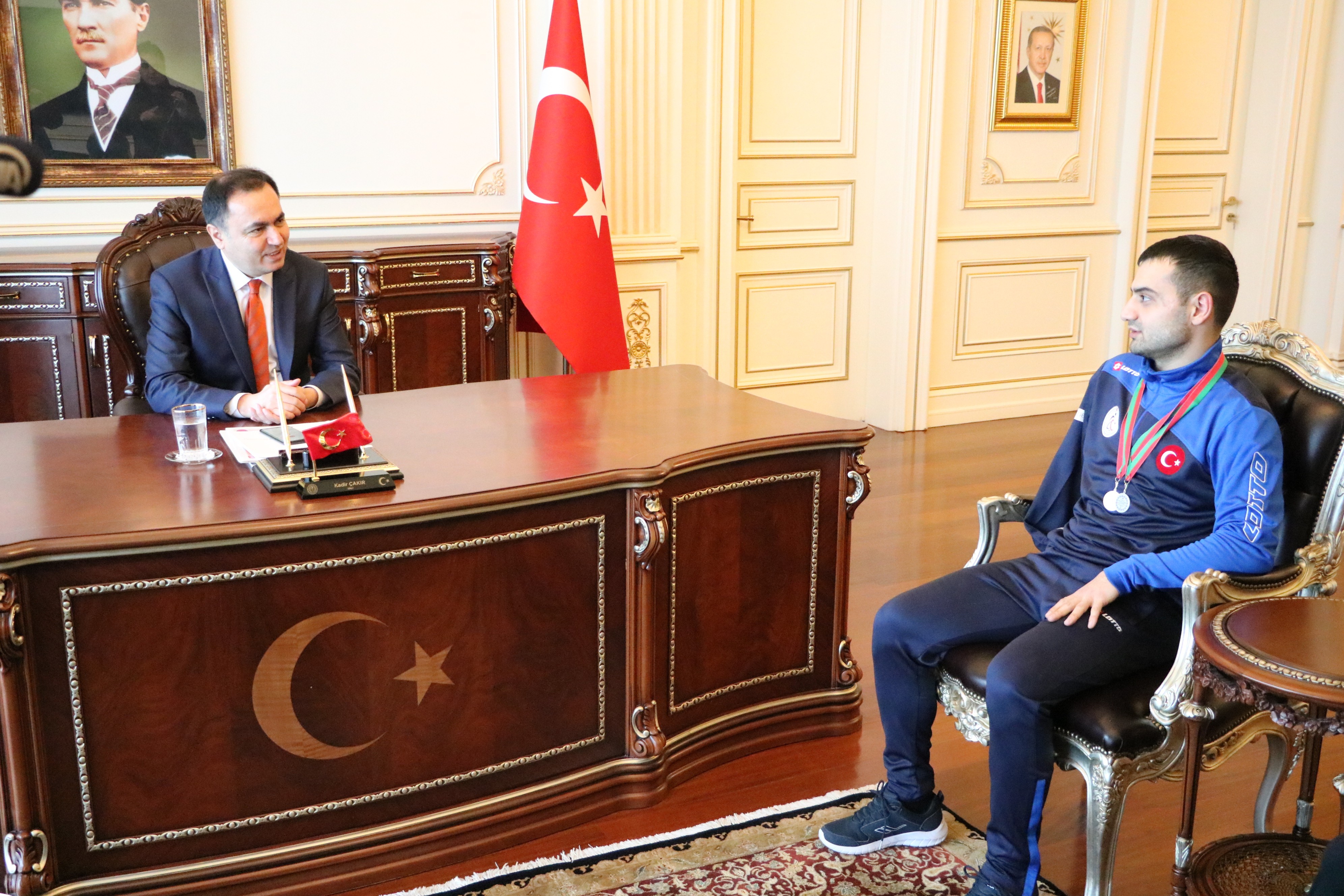 Vali Kadir Çakır, Belarus’un başkenti Minsk’te düzenlenen Ulusal Açık Paralimpik Yüzme Şampiyonası’nda altın madalya kazanarak Avrupa şampiyonu olan engelli sporcu Rahmi Ersoy’u tebrik etti.