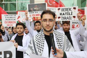 Yozgat Bozok Üniversitesi Tıp Fakültesi öğrencileri, işgalci İsrail’in Gazze’deki hastanelere yönelik düzenlediği saldırıları protesto etti.