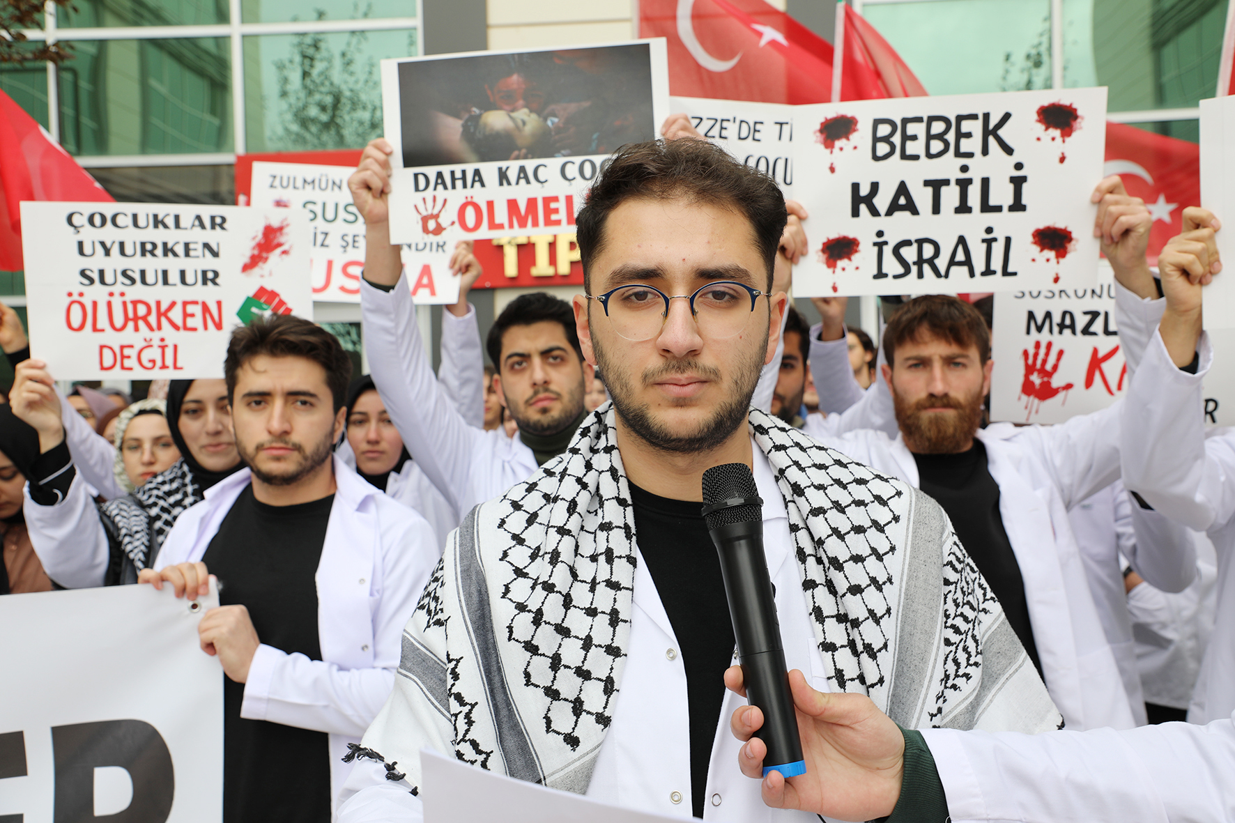Öğrencilerde “Zulmün teşhir edildiği yerde tarafsızlık zulme ortak olmaktır.” diyerek, hekimlik mesleğinin insanlık onurunu koruma göreviyle hareket ettiklerini ve İsrail’e karşı boykotlarını sürdüreceklerini vurguladılar. / Cemil MERMERTAŞ