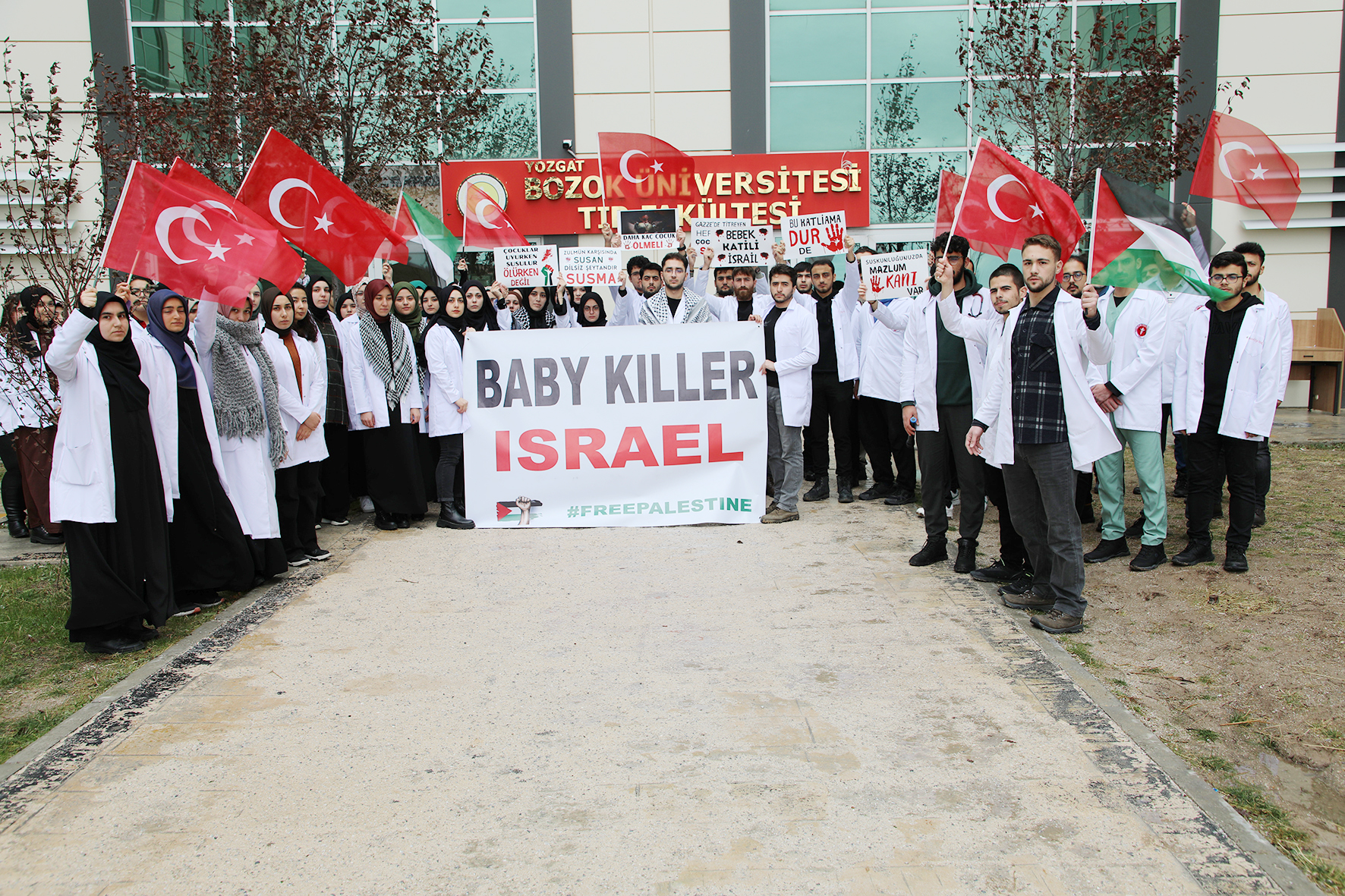 Bozok Üniversitesi Tıp Fakültesi önünde bir araya gelen doktor adayı öğrenciler, Türkiye ve Filistin bayrakları taşıyarak, İsrail’in sivillerin bulunduğu hastaneleri bombalamasını kınadı.