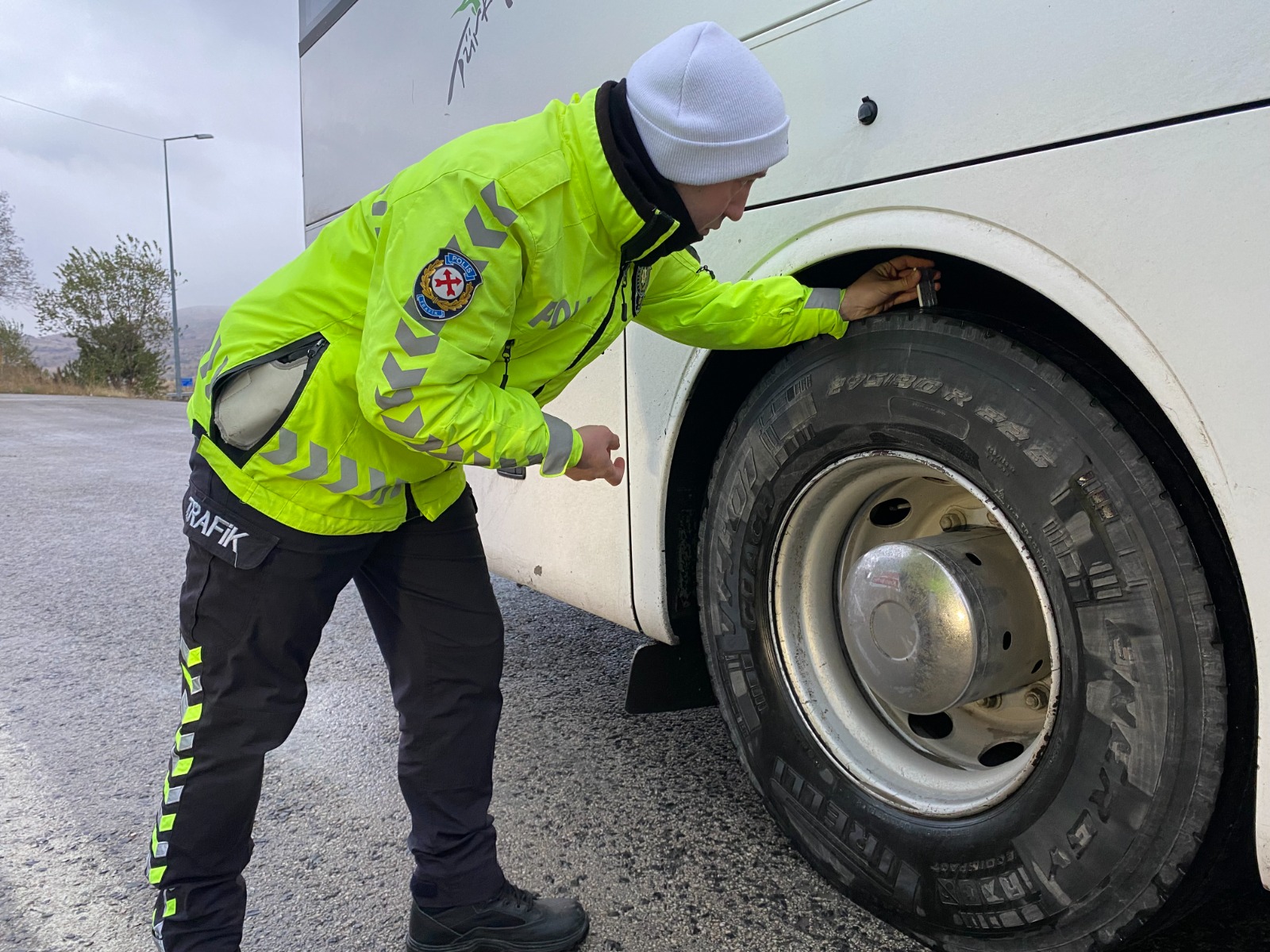 Yozgat İl Emniyet Müdürlüğü, Bölge Trafik Şube Müdürlüğü ekipleri tarafından şehirlerarası yük ve yolcu taşıyan ticari araçlara yönelik kış lastiği denetimi gerçekleştirildi. Yapılan denetimlerde ticari araçların kış lastikleri kontrol edilerek derinlikleri ölçüldü.
