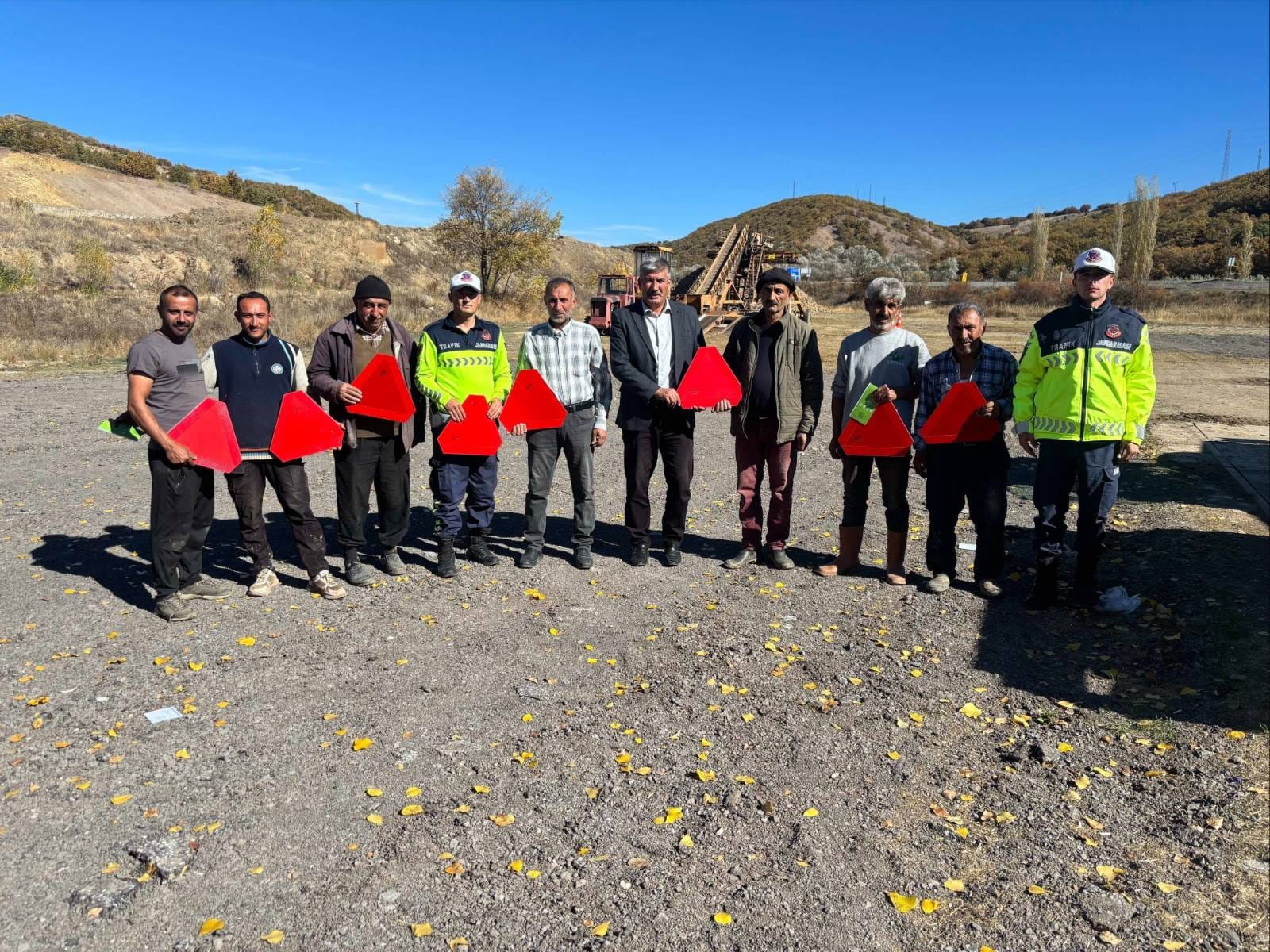 Etkinlik kapsamında, Akdağmadeni Kaymakamlığı tarafından temin edilen römork arkası üçgen reflektörler ve bilgilendirme broşürleri traktör sürücülerine dağıtıldı.