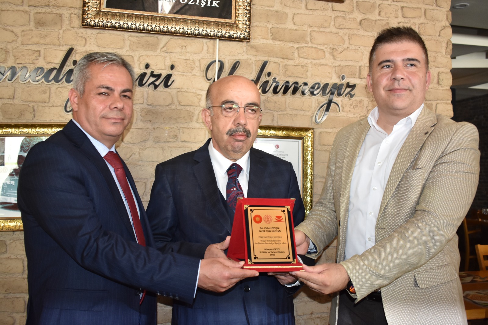 Türk Mutfağı’na, Yozgat’ın tanıtımına katkılarından dolayı Zafer Türk Mutfağı’na plaket takdim eden Çiftçi, “Zafer Türk Mutfağı’na bugüne kadar yaptıkları hizmetlerden dolayı ve buradaki arkadaşlarımıza özverili çalışmalarından dolayı, işletmenin müdürü başta olmak üzere bütün personele ve bu işi gönülden götüren Zafer Ağabey’e teşekkür ediyoruz” diye konuştu.