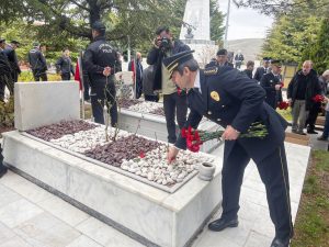 POMEM Müdürü Zafer Kişi ise, ‘’Bu kutsal mesleği icra ederken yüz yıllardır bu güne süzülerek gelen kurum kültürümüzün değerleri başta olmak üzere tüm insanlık değerlerini özümsemiş polisler olarak büyük bir özveriyle günümüz şartlarına ve değişimlerine uyum sağlamak daima hakka, hukuka ve adalete hizmet etmek yolunda kendimizi geliştirmek en önemli idealimizdir. Türk Polis Teşkilatı’nın 178’inci kurulmuş yıldönümü vesilesi ile aziz şehitlerimizin huzurundayız. Manevi miraslarınızı daima kalplerimizde hissettiğimiz ve geride kalan ailelerinizi emanet bildiğimiz sizler vatanın ve milletin bölünmez bütünlüğü, huzuru ve güvenliği uğruna gözünüzü kırpmadan şahadete yürüdünüz. Bu anlamlı günümüzde sizlerine saygıyla, sevgiyle ve rahmet ile yad ediyoruz. Sizden aldığımız manevi güç ile bu şerefli görevi icra ediyoruz ve devraldığımız mirasınızı emanet edeceğimiz şuurlu, ahlaklı fedakar Türk Polisleri yetiştirmeye gayret gösteriyoruz. Emanetiniz emin ellerde. Bu güne kadar olduğu gibi bugünden sonra da Allah için, Millet için, Devlet için carla başla mücadele edeceğimize dair yeminimizi yineliyor şefkati ve şecaati yüreğine sığdırmış tüm meslektaşlarımı ve bu ülkeyi bize vatan kılmak için canlarını feda eden tüm şehit ve gazilerimizi sevgi, rahmet ve hürmetle anıyor saygılar sunuyorum’’ diye konuştu. Haber Merkezi