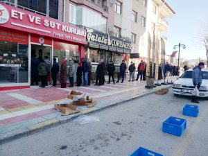 Et ve Süt Kurumu Yozgat satış ofisinde piyasanın altında fiyatla satışı yapılan et ve et ürünlerini alabilmek için kuyruğa giren vatandaşlar adeta ucuz et alabilmek için birbirleri ile yarışıyor. Uzun kuyrukların oluştuğu Satış Ofisinde yoğunluk oluşurken vatandaşlar, sabahın erken saatlerinde gelerek Et ve Süt Kurumunun etinde almak için sıraya girdiklerini söylediler. Ekonomik durumlardan dolayı kasap, market gibi yerlerden et alamadıklarını dile getiren Vatandaşlar, Et ve Süt Kurumu piyasanın altında fiyatla et satışı gerçekleştirdiği için bütçelerine göre buradan et ve et ürünlerini aldıklarını ifade ettiler.