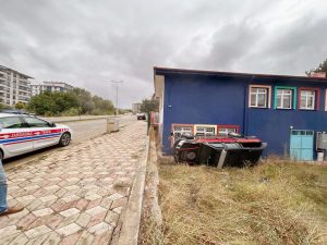 Yozgat İl Sağlık Müdürlüğüne bağlı Ulusal Medikal Kurtarma Ekibine (UMKE) ait araç, Şehir Hastanesi yolunda yağan yağmur ile kayganlaşan yol nedeniyle direksiyon hakimiyetini kaybeden sürücü yoldan çıkarak bir okulun bahçesine aracı devirdi.