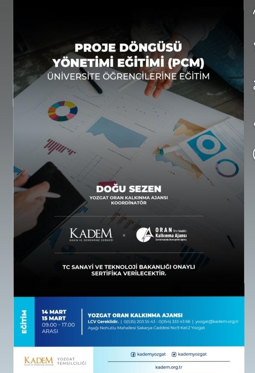 KADEM Yozgat temsilciliği ve ORAN Kalkınma ajansı tarafından 14- 15 Mart tarihleri arasında Üniversite öğrencilerine yönelik proje eğitimi (PÇM) eğitimi verilecek.